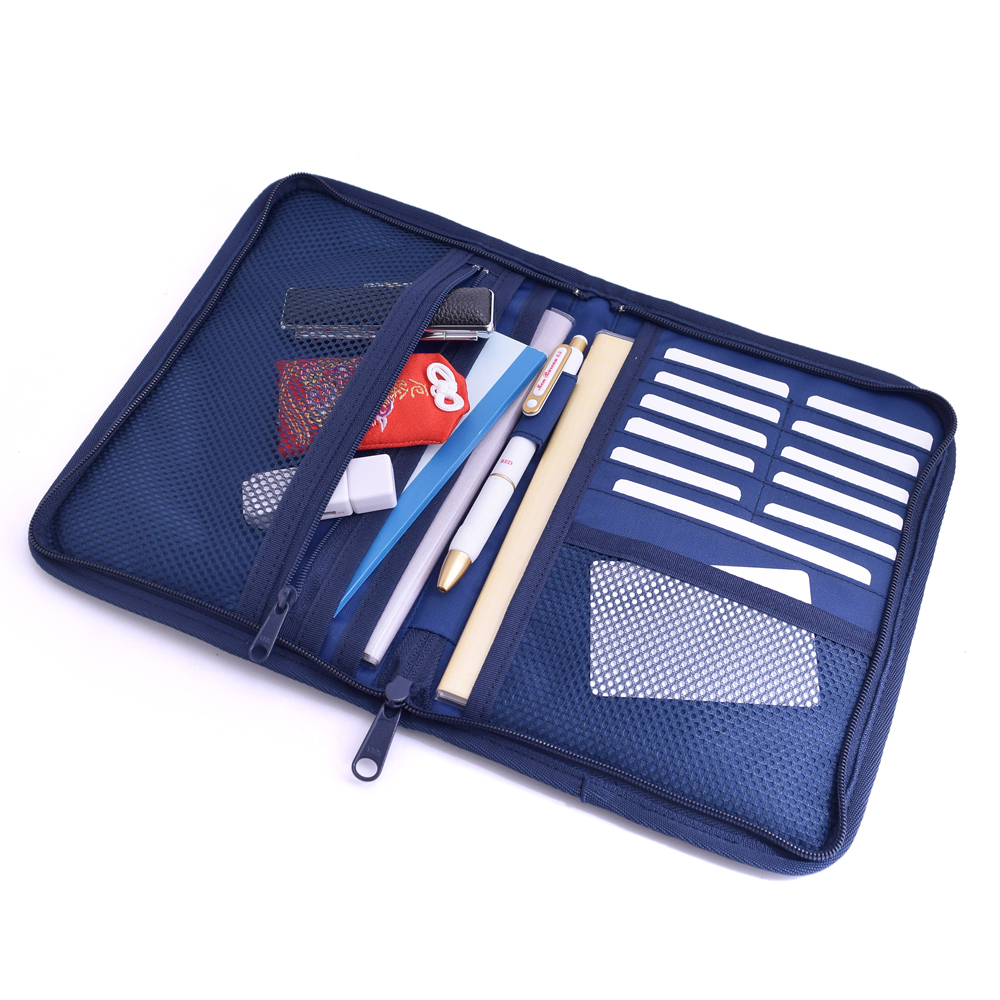 貴重品を収納できるファスナー付きポケットやカードポケット、ペンホルダー、中身が確認できるメッシュポケットなど小分けに便利なポケットが満載です。