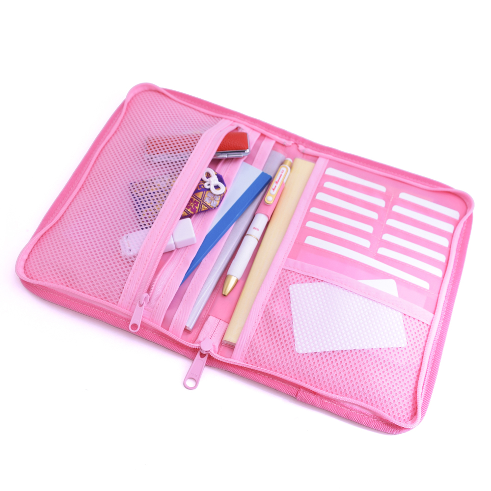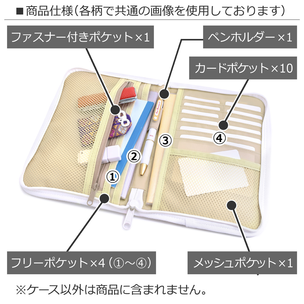 貴重品を収納できるファスナー付きポケットやカードポケット、ペンホルダー、中身が確認できるメッシュポケットなど小分けに便利なポケットが満載です。