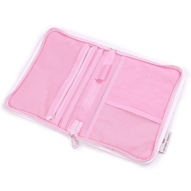 ファスナーで周囲をしっかりと開閉できるタイプで、中身を落とす心配がありません。Mサイズの母子手帳(タテ約18.2cm×ヨコ約12.8cm)に対応しています。