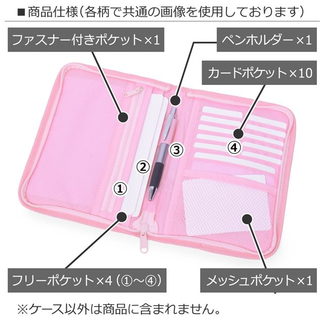 貴重品を収納できるファスナー付きポケットやカードポケット、ペンホルダー、中身が確認できるメッシュポケットなど小分けに便利なポケットが満載です。