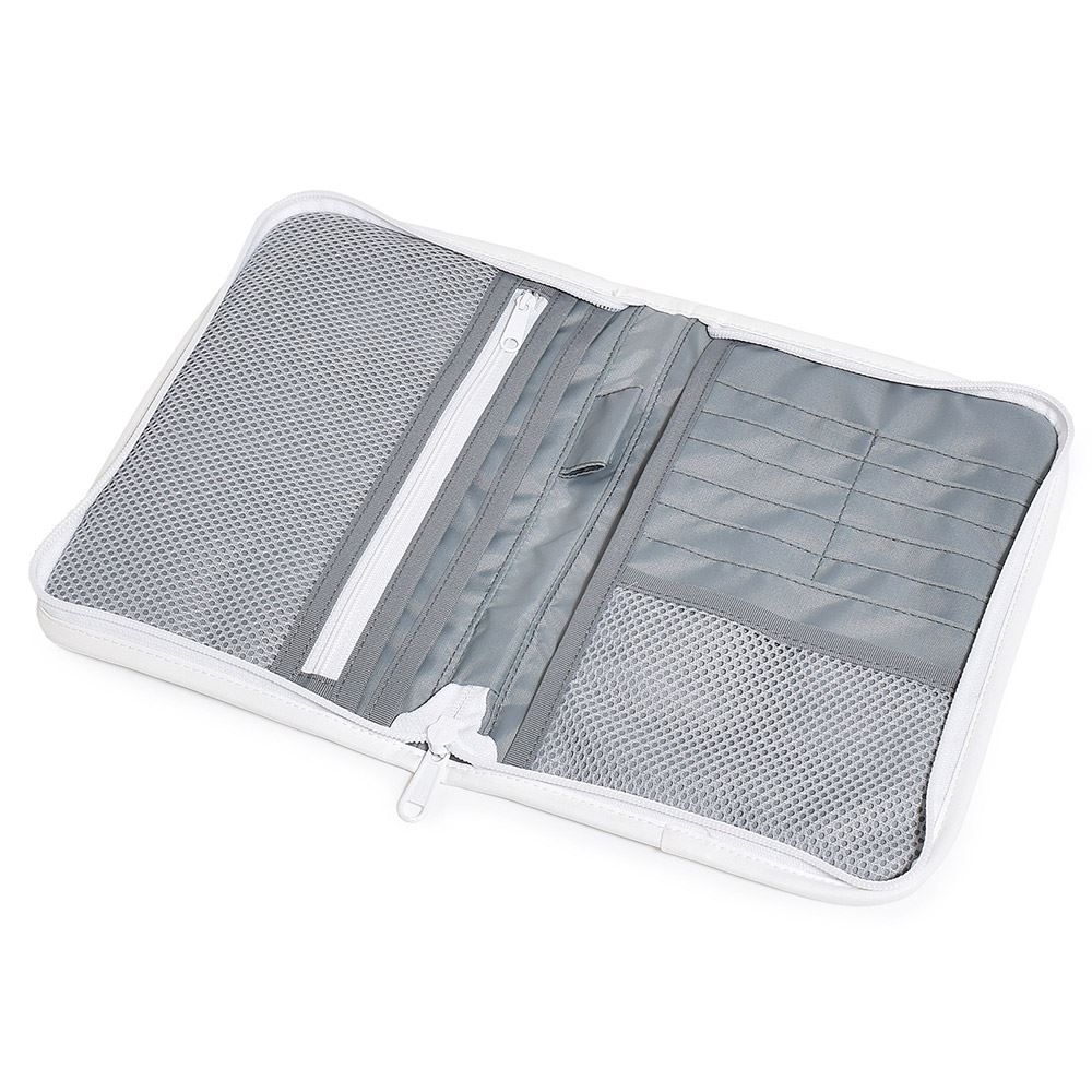ファスナーで周囲をしっかりと開閉できるタイプで、中身を落とす心配がありません。Mサイズの母子手帳(タテ約18.2cm×ヨコ約12.8cm)に対応しています。