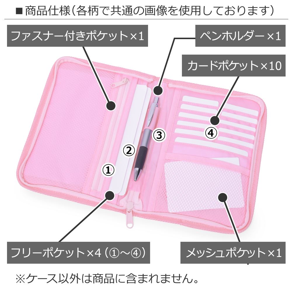 貴重品を収納できるファスナー付きポケットやカードポケット、ペンホルダー、中身が確認できるメッシュポケットなど小分けに便利なポケットが満載です。