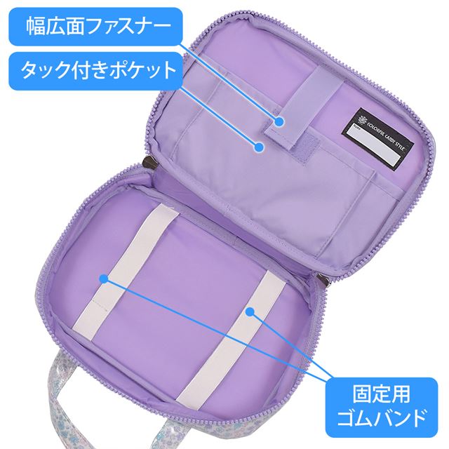 中身を固定できるゴムバンド付きなので、気になるカチャカチャ音やお道具が傷つくのを防ぎます。内側ポケットはタック付きで大容量。はぎれなども収納でき、幅広面ファスナーで固定できます。