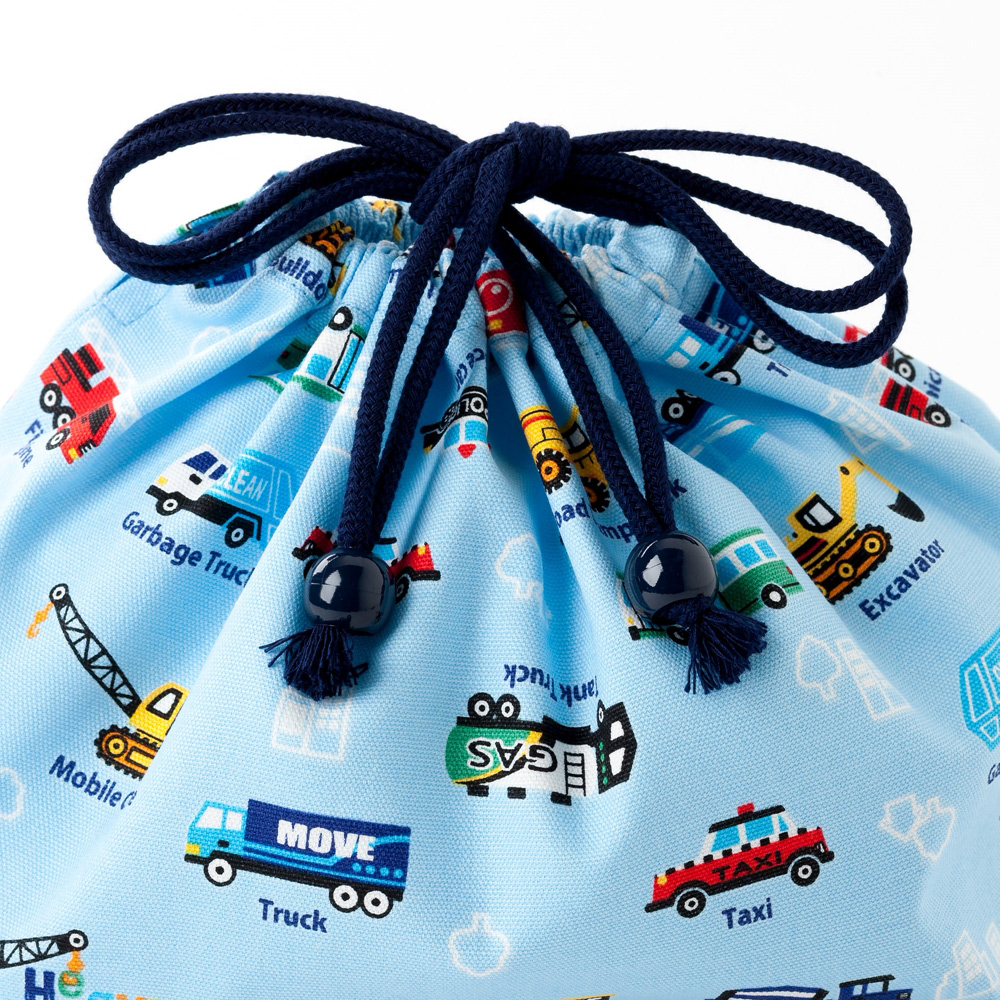 巾着 中 マチ有りお弁当袋(ネームタグ付き) アクセル全開はたらく車(ライトブルー)