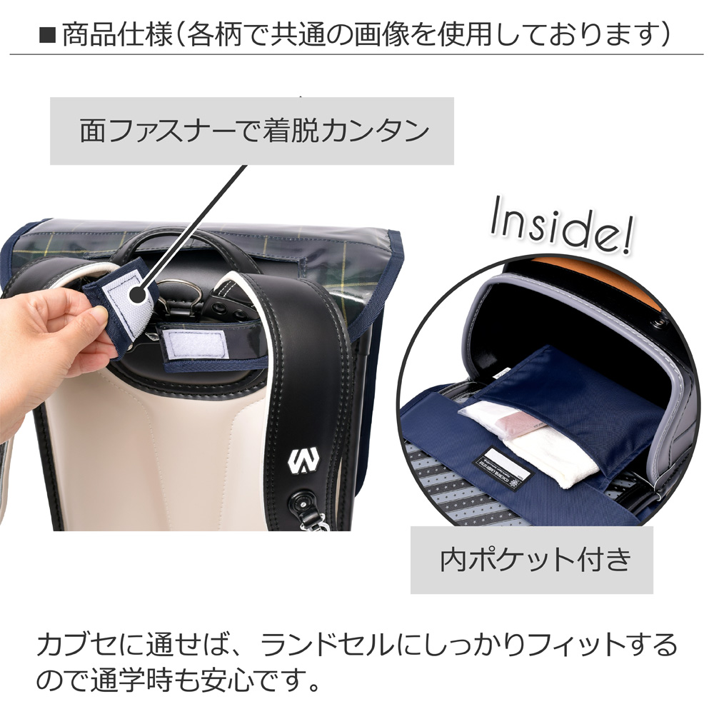 6年間使う大切なランドセルをしっかりとガード。私立小学校などの校章付きランドセルの校章も隠れません。