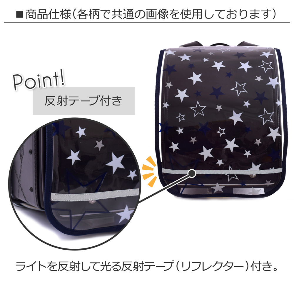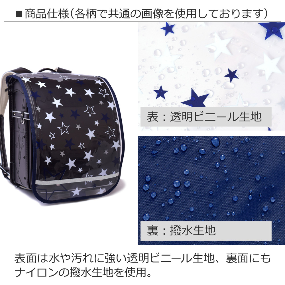 ランドセルの色味を活かしながら、お気に入りデザインが楽しめる、透明度の高いビニール生地を採用。