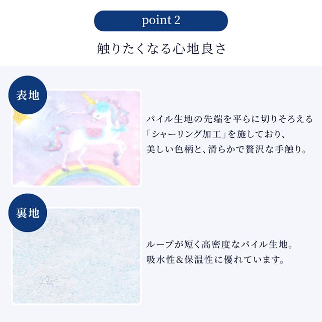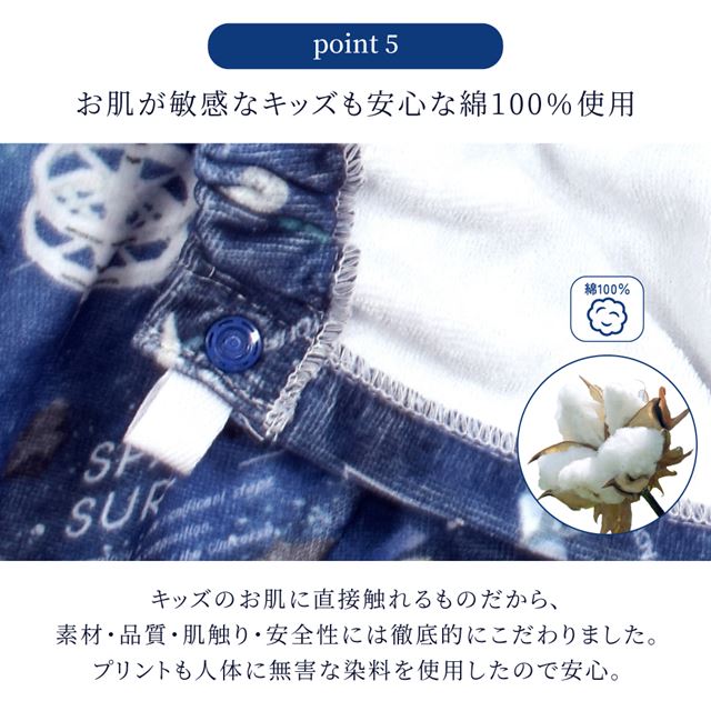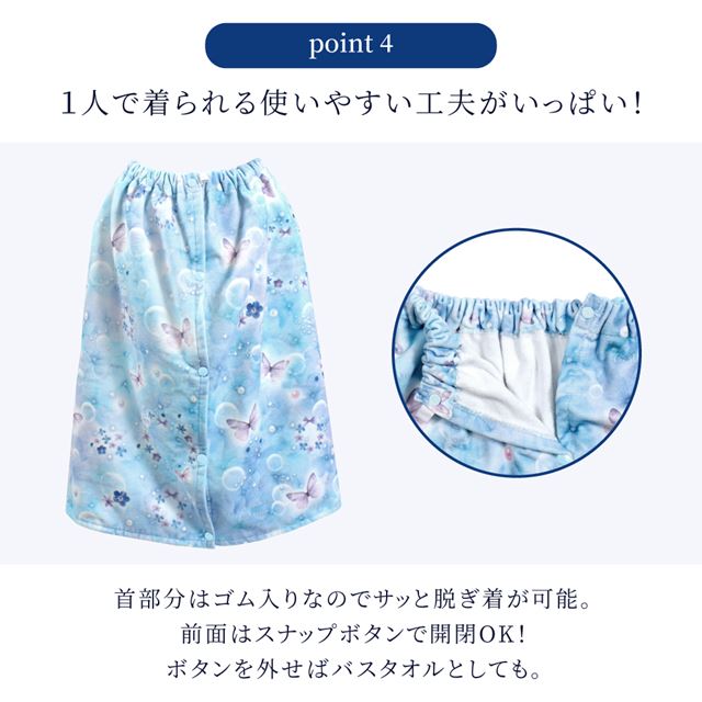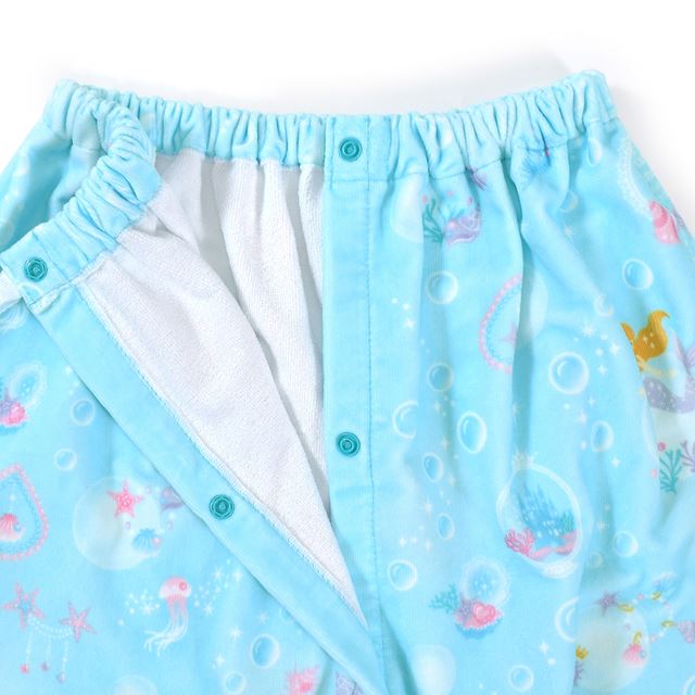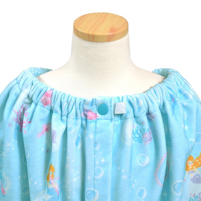 首部分はゴム入りなのでサッと脱ぎ着が可能。両手を離してもずり落ちないから着替えがラクチン!着替えが苦手な小さなお子さまでも人目を気にせず安心です。前面はスナップボタンで開閉OK!ボタンを外せばバスタオルとしても。