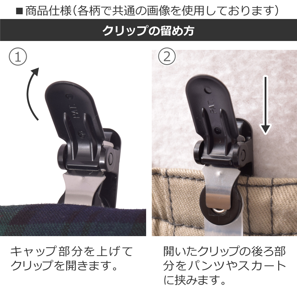 ボトムスのウエスト部分にクリップをはさむだけなので服を痛める心配もなく、手軽に装着できます。