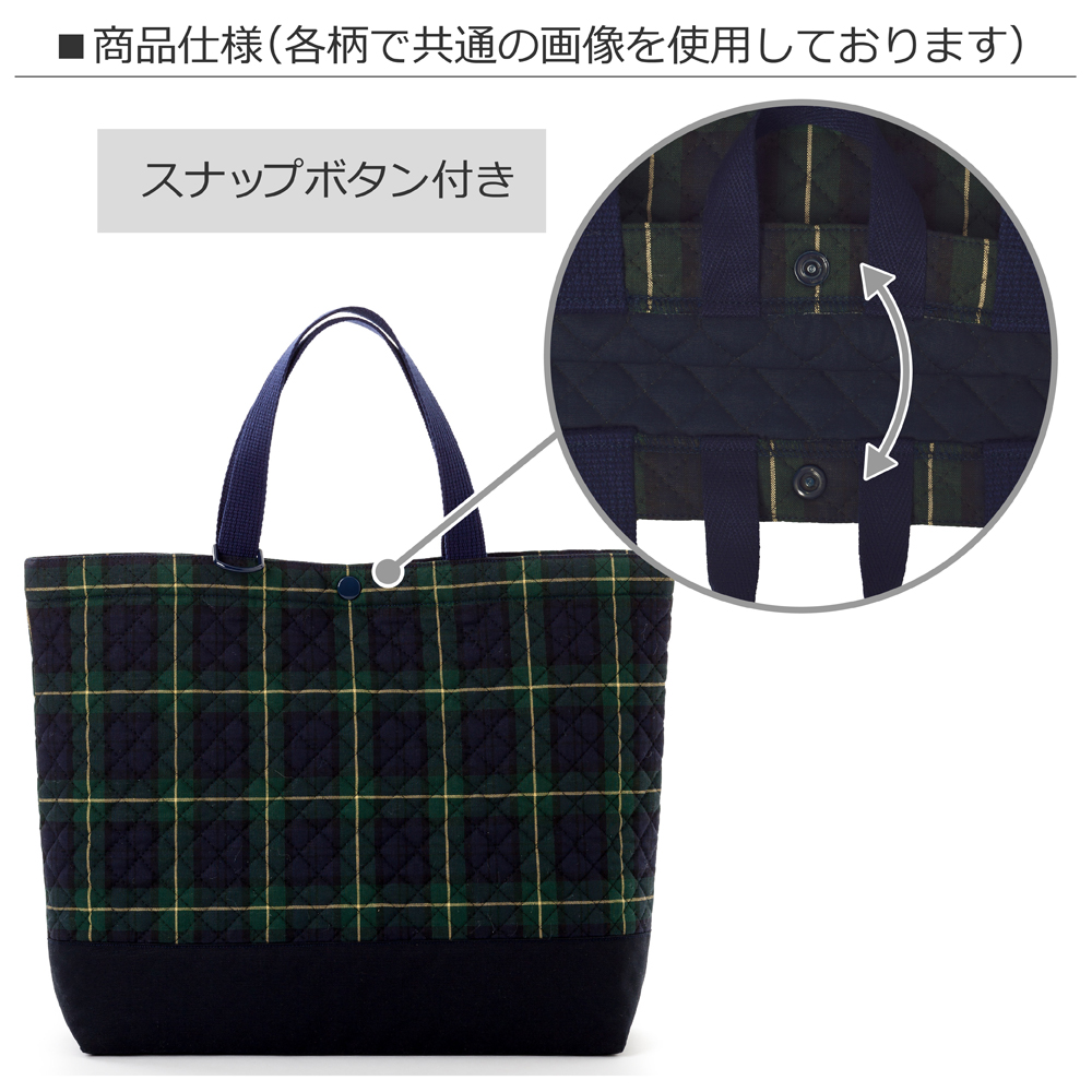 一般的な大きさのお道具箱(幅約23cm×奥行約33cm×高さ約6cm)が入るマチ付きバッグ。学期の始まりや終わりなど、まとめてたくさんの荷物を持ち運べます。本体は中綿入りのしっかりとしたキルティング生地。底布は丈夫なオックス生地なので耐久性も抜群です。