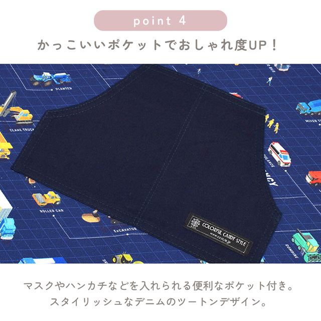 2.肩紐とポケットの紺色デニムがポイント