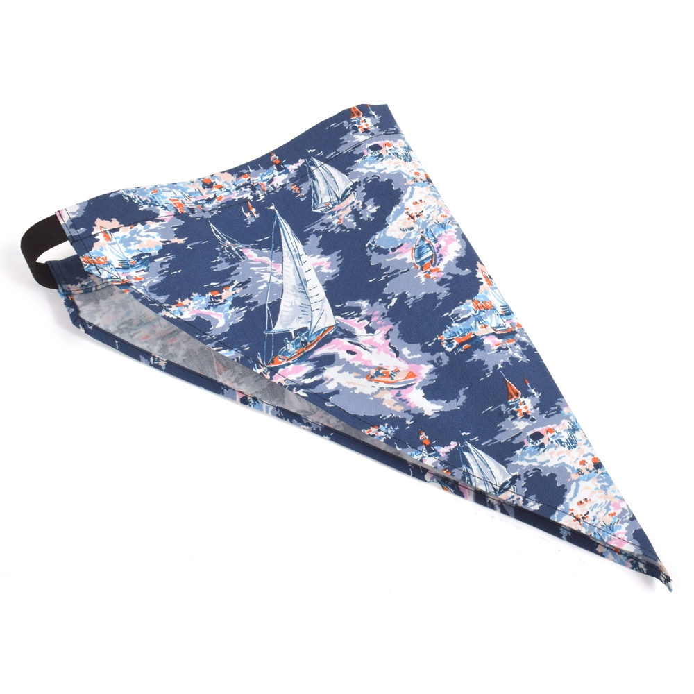 三角巾の後ろはずり落ちにくいゴム仕様。サイズが大きい場合は、ゴムを少し縫って調節して下さい。
