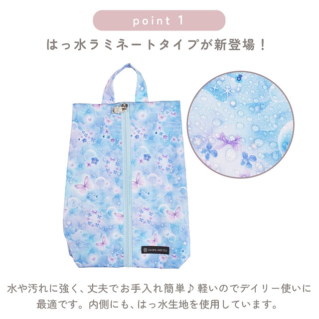 晴れの日も雨の日も、1年中安心して使える全天候型「はっ水ラミネート」のシューズケース。高学年まで使える余裕のサイズ感。上履きの持ち帰りの日が楽しみになるおしゃれな柄です。レッスンバッグや巾着袋等とのトータルコーディネートもおすすめです。