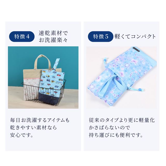 ※撥水生地の巾着は、生地の特性上使い始めはお子様での開け閉めが難しい為、事前にお洗濯後何度か開閉を繰り返して生地を慣らしてご使用ください。
