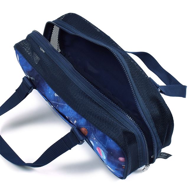 水彩絵の具12色セットやパレット、筆、筆洗いなど美術の授業や図画工作に欠かせない道具がすべてそろっています。バッグは左右に大きく開く両開きファスナー仕様。ゆったりサイズ設計なので中身も出し入れしやすいです。プライバシーに配慮し、ネームタグはブランドタグの裏側に付いています。さらに長さ調節が可能なショルダーベルト付きなので肩掛けもOK。