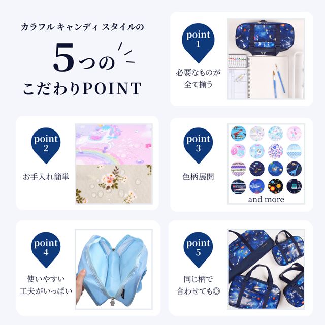 快適さを追求した新素材は、突然の雨などに濡れてもすぐ乾き、軽量で耐久性もバツグン。今後もおしゃれ&可愛い柄で登場予定です。