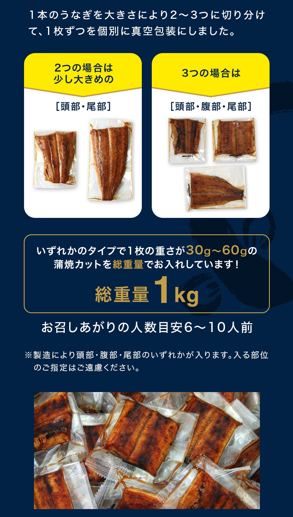 食べやすくカット済で保存もしやすい!外装もなくしてコストを抑えた総重量1kgセット。 1枚の重さが50g前後の詰め合わせになります。リピーター様・ご自宅向けのオススメ商品です。 *製造状況により、頭部のみ、腹部のみ、尾部のみ、となる場合がございます。 *山椒別売りのため、別途ご購入下さい。