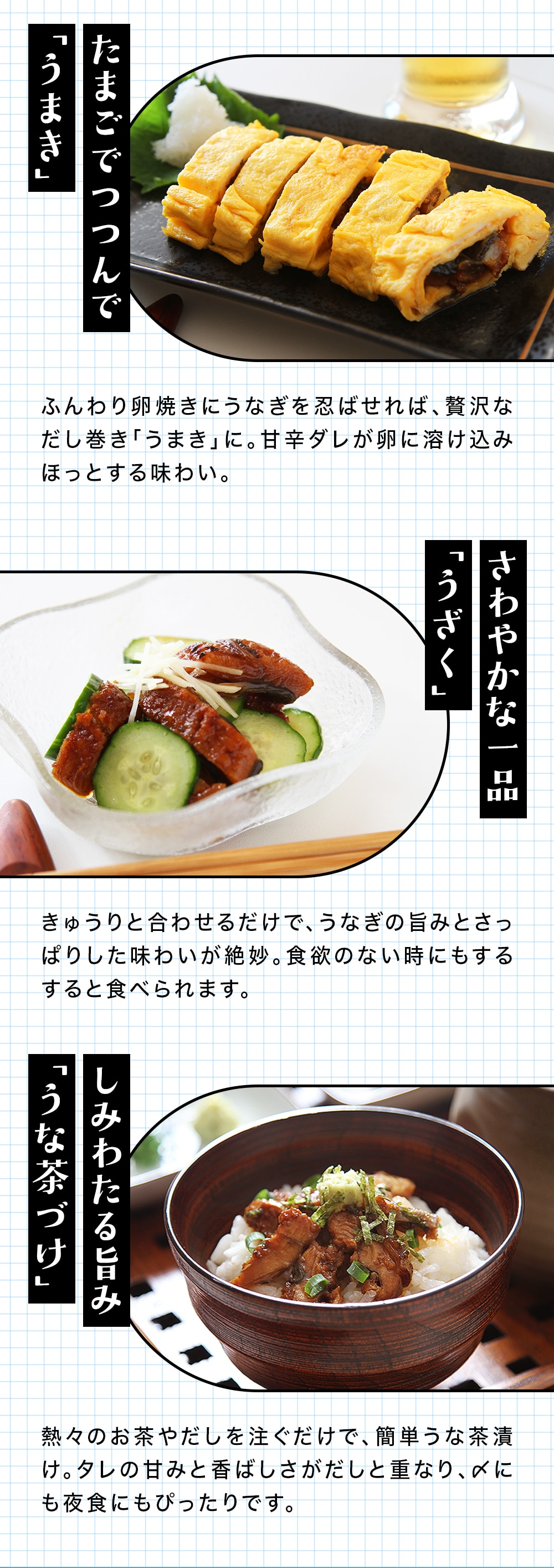 二ホンウナギ(国産)、糖類(ぶどう糖果糖液糖、砂糖、水あめ)、しょうゆ(小麦・大豆を含む)、みりん、発酵調味料、食塩、還元水あめ、でん粉、粉飴、酵母エキス、/着色料(カラメル)、調味料(アミノ酸等)
