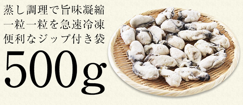 蒸し牡蠣500gセット 蒸し調理済みで安心安全!1粒ずつのバラ冷凍で使い勝手抜群です。 生牡蠣に比べて縮みが少ないのが蒸し牡蠣の特徴!