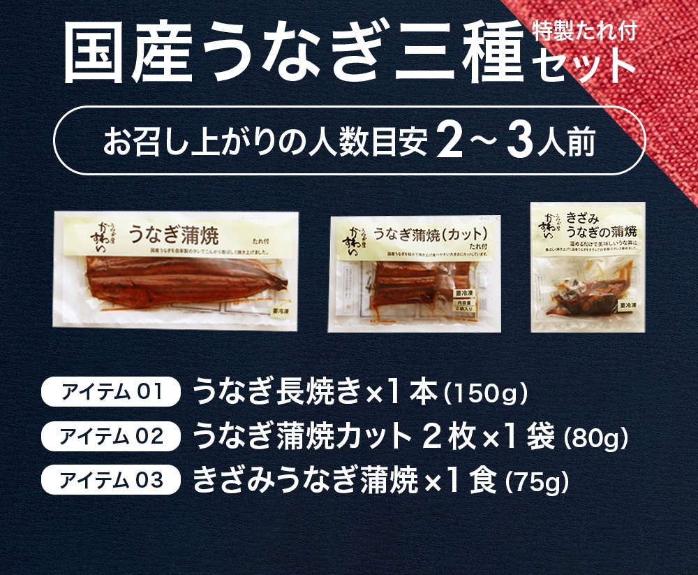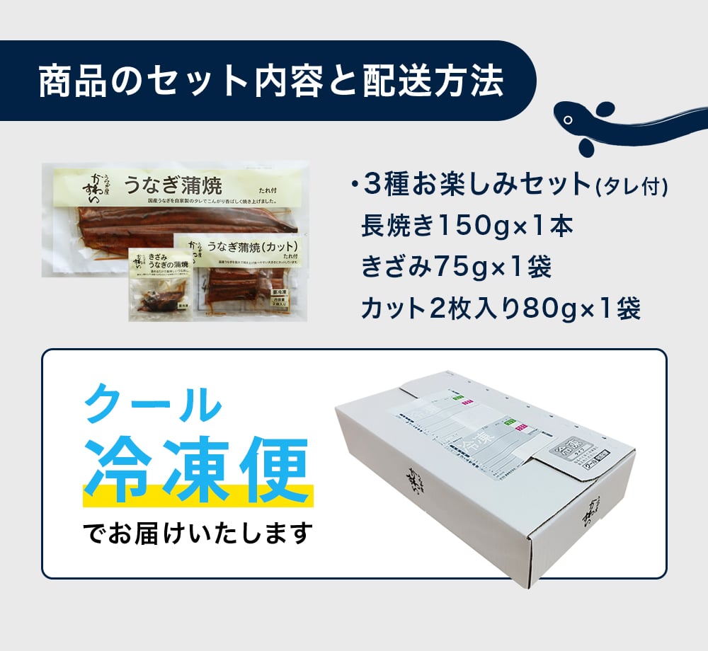 長焼き・カット・きざみの3点が入ったお楽しみミニセット! 長焼きは1本150gで食べ応え満点。 簡単・便利なカットうなぎは、欲しい時に欲しい分だけお召し上がり頂けます。 きざみうなぎは、モンドセレクション最高金賞受賞!お湯ポチャ4分でお手軽本格なひつまぶしをお楽しみ頂けます。 外はサクッ!中はふんわり蒲焼きうなぎをお楽しみください。 *山椒別売りのため、別途ご購入下さい。