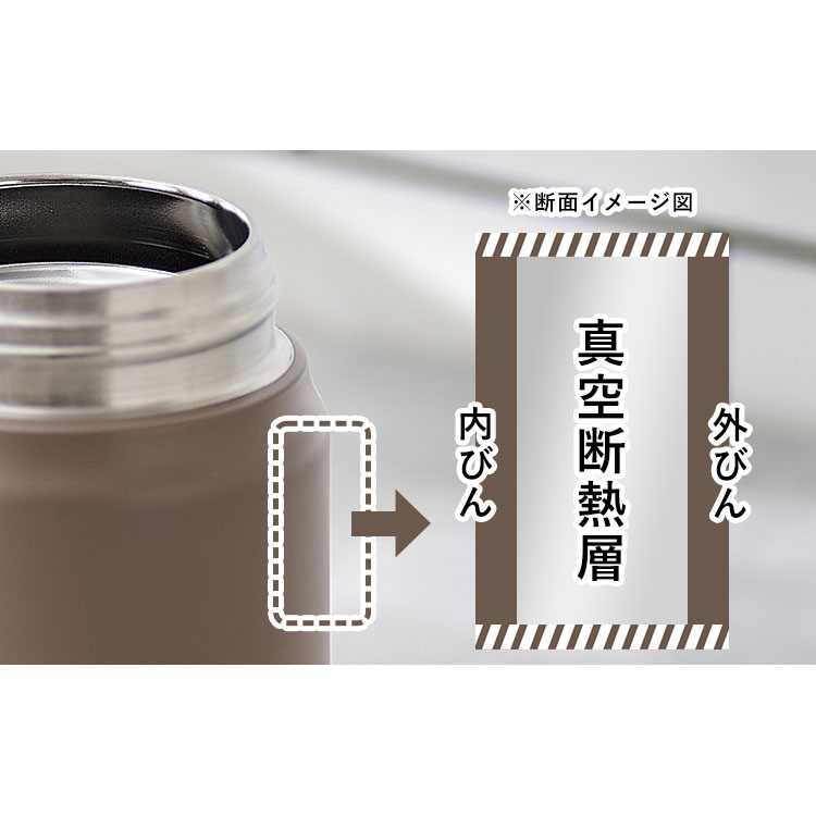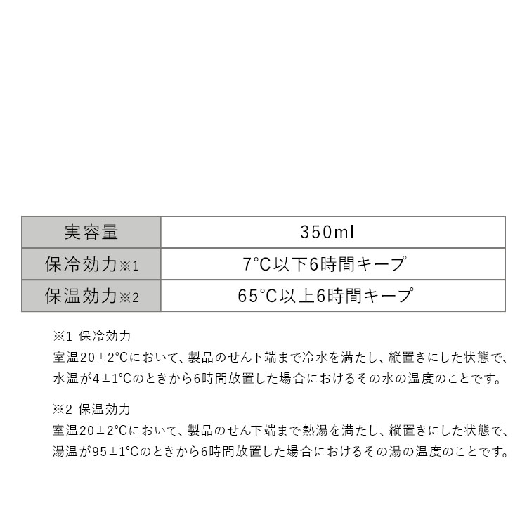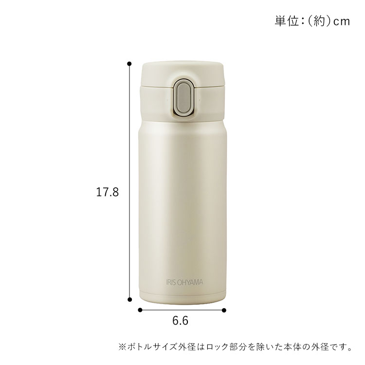 【商品説明】 ★スポーツドリンク対応★ ワンタッチオープンで、飲みたいときにすぐ飲める。シンプルでかわいい、絶妙なくすみ感のステンレスマグボトル。いつでもサッと取り出せて、片手でワンタッチオープン。片手で開け閉めできるから、運動中に素早く水分補給したいときにもぴったり。持ち歩きも安心のロック機能付き。ロックの解除ももちろん片手でOK。飲み物の流れを良くするため、空気穴を設けました。スムーズに出てくるのでゴクゴク飲める!高い保温力と保冷力。真空断熱層がおいしい温度をキープします。凹凸の少ないシンプルデザインで、カバンへの出し入れもスムーズ。パーツは分解できるので、しっかり洗えて衛生的。【商品仕様】●商品サイズ(cm)幅約6.6×奥行約6.96×高さ約17.8●質量約207g●実容量約0.35L●保温効力 ※165度以上(6時間)●保冷効力 ※27度以下(6時間)●材料の種類本体:ステンレス鋼(外側 アクリル樹脂塗装)ふた:ポリプロピレン飲み口:ポリプロピレンパッキン:シリコーン※1 保温効力 室温20±2℃において、製品のせん下端まで熱湯を満たし、縦置きにした状態で、湯温が95±1℃のときから6時間放置した場合におけるその湯の温度のことです。※2 保冷効力 室温20±2℃において、製品のせん下端まで冷水を満たし、縦置きにした状態で、水温が4±1℃のときから6時間放置した場合におけるその水の温度のことです。