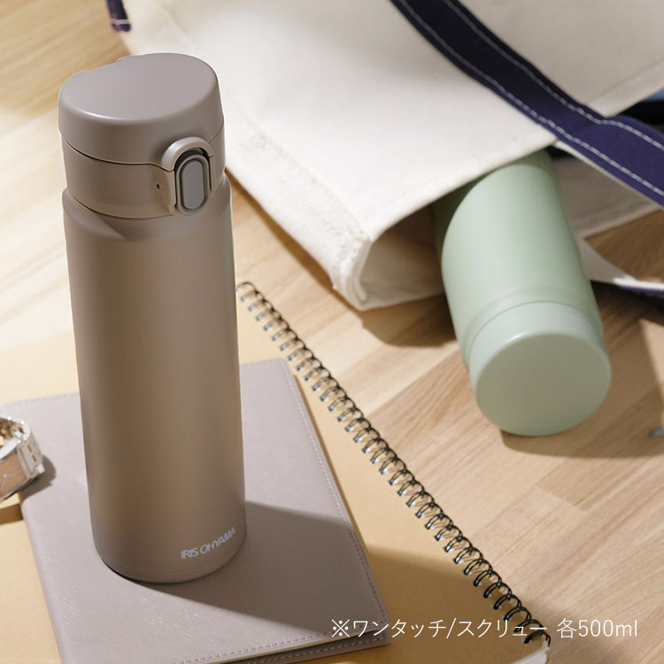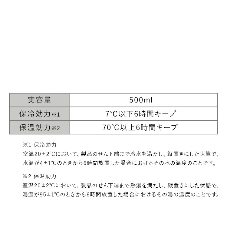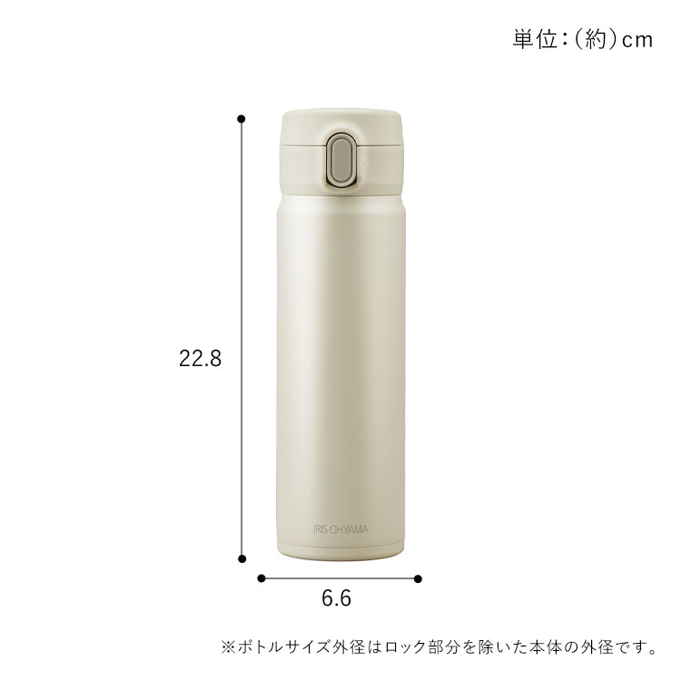 【商品説明】 ★スポーツドリンク対応★ ワンタッチオープンで、飲みたいときにすぐ飲める。シンプルでかわいい、絶妙なくすみ感のステンレスマグボトル。いつでもサッと取り出せて、片手でワンタッチオープン。片手で開け閉めできるから、運動中に素早く水分補給したいときにもぴったり。持ち歩きも安心のロック機能付き。ロックの解除ももちろん片手でOK。飲み物の流れを良くするため、空気穴を設けました。スムーズに出てくるのでゴクゴク飲める!高い保温力と保冷力。真空断熱層がおいしい温度をキープします。凹凸の少ないシンプルデザインで、カバンへの出し入れもスムーズ。パーツは分解できるので、しっかり洗えて衛生的。【商品仕様】●商品サイズ(cm)幅約6.6×奥行約6.96×高さ約22.8●質量約296g●実容量約0.5L●保温効力 ※170度以上(6時間)●保冷効力 ※27度以下(6時間)●材料の種類本体:ステンレス鋼(外側 アクリル樹脂塗装)ふた:ポリプロピレン飲み口:ポリプロピレンパッキン:シリコーン※1 保温効力 室温20±2℃において、製品のせん下端まで熱湯を満たし、縦置きにした状態で、湯温が95±1℃のときから6時間放置した場合におけるその湯の温度のことです。※2 保冷効力 室温20±2℃において、製品のせん下端まで冷水を満たし、縦置きにした状態で、水温が4±1℃のときから6時間放置した場合におけるその水の温度のことです。