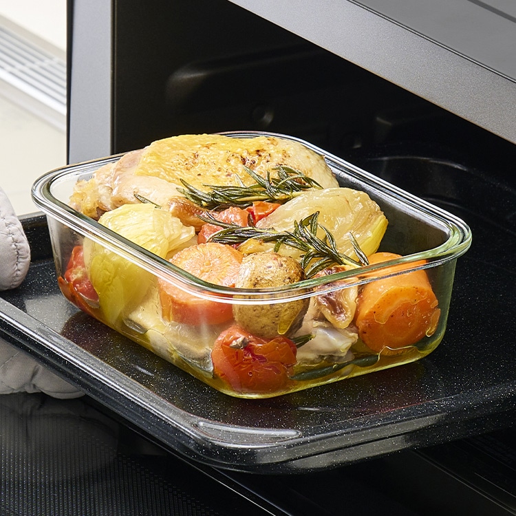 【商品説明】調理から保存までこれひとつ!レンジ、オーブン対応の耐熱ガラス容器です。グラタン皿にピッタリのLサイズ。そのまま食卓に出せるシンプルなデザイン。見た目が映えるだけでなく、洗い物も減らせます。サイズ違いの容器は重ねてコンパクトにお片付け可能。高さがすっきり揃うデザインになっています。見た目にも美しく、気持ちよく収納できます。フタには液ダレしにくいパッキン付き。350℃までの加熱調理が可能。(フタは外してください)電子レンジ・オーブンで使えるから、食材を入れてそのまま加熱OK!出来あがったらそのまま食卓へ。保存容器として冷蔵庫でも大活躍。中身が見えるので探しやすく、フタがあるので重ねることもできます。-18℃までの冷凍保存も可能です。ガラス製だから、油落ちが良くラクに洗えます。また、カレーなどを入れてもニオイが残りにくいのでいつでも清潔を保てます。容器は食洗機対応。(フタは食洗機には入れられません)【商品仕様】●商品サイズ(cm)L(1040ml):幅約19.7×奥行約14.8×高さ約6.8●材質本体:ホウケイ酸ガラスフタ:ポリカーボネートパッキン:シリコーンゴム※フタは電子レンジ、オーブン、食洗機にはお使いいただけません