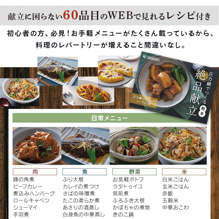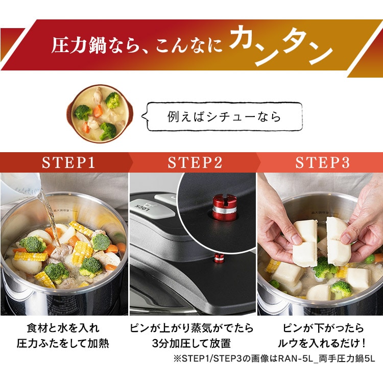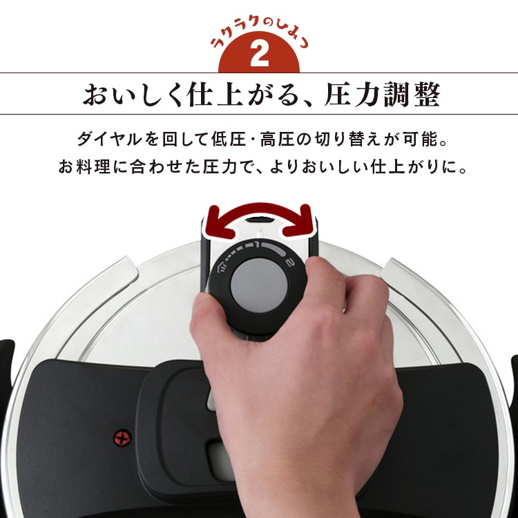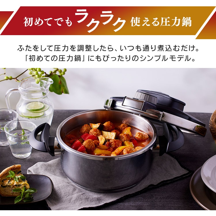 2025年6月4日 商品ページ内画像を一部変更致しました。 2025年5月下旬より商品内容に一部変更がありました。 ■変更内容■ レシピブッグ付き→QRコードから見れるレシピ お届け先が沖縄・離島の場合、お届け日時のご希望に沿えない場合がございます。予めご了承ください。 ■商品サイズ(cm) 幅約37×奥行約23.8×高さ約18.5(圧力ふた装着時) ■満水容量 4.0L ■材質 本体:ステンレス鋼(クロム18%、ニッケル8%) はり底:ステンレス鋼(クロム16%)、底の厚さ4.5mm(はり底を含む) ■圧力切替 2段階圧力切り替え ■圧力設定 低圧:60kPa 高圧:100kPa ■対応熱源 IH・ガス対応 ■セット内容 本体、圧力ふた、ガラスふた、中かご・中かご台、クリーニングピン、QRコードから見れるレシピ シンプルな操作で初めての圧力鍋にもおすすめ。 食べる幸せのとなりに。 コトコトじっくり煮込んだシチュー。 手間ひまかけたロールキャベツ。 圧力鍋なら、高温・高圧調理であっという間においしく仕上がる。 おいしくラクする、圧力鍋。 初めてでもラクラク使える! ふたをして圧力を調整したら、いつも通り煮込むだけ。 「初めての圧力鍋」にもぴったりのシンプルモデル。 圧力ふたはボタンを押すだけのワンタッチ開閉。 圧力調理中はしっかりロック。 鍋の圧力が完全に下がらないとふたが開ない設計になっているので安心。 ダイヤルを回して低圧・高圧の切り替えが可能。 お料理に合わせた圧力で、よりおいしい仕上がりに。 一般的なステンレス鍋よりも加熱時間が短くなるので、時間も光熱費も節約できます。 付属のガラスふたで通常の鍋としても使用可能。 料理の温めなおしにも便利です。 初めての圧力調理もはかどります。