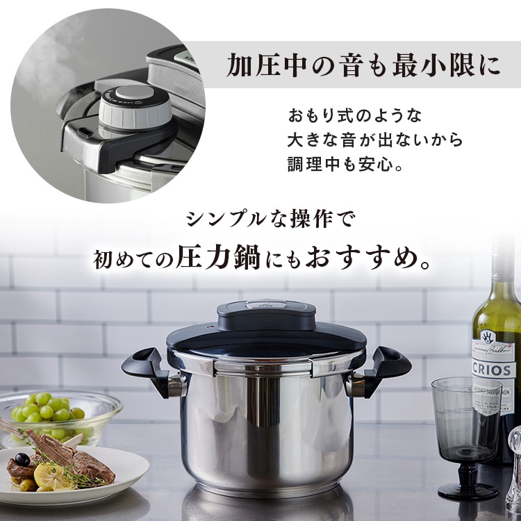 2025年10月3日 商品仕様が一部変更になりました。 レシピブック付き→WEBから見れるレシピ付き お届け先が沖縄・離島の場合、お届け日時のご希望に沿えない場合がございます。予めご了承ください。 ■商品サイズ(cm) 幅約37×奥行約23.8×高さ約23.8(圧力ふた装着時) ■満水容量 6.0L ■材質 本体:ステンレス鋼(クロム18%、ニッケル8%) はり底:ステンレス鋼(クロム16%)、底の厚さ4.5mm(はり底を含む) ■圧力切替 2段階圧力切り替え ■圧力設定 低圧:60kPa 高圧:100kPa ■対応熱源 IH・ガス対応 ■セット内容 本体、圧力ふた、ガラスふた、中かご・中かご台、クリーニングピン、レシピ(WEB) シンプルな操作で初めての圧力鍋にもおすすめ。 食べる幸せのとなりに。 コトコトじっくり煮込んだシチュー。 手間ひまかけたロールキャベツ。 圧力鍋なら、高温・高圧調理であっという間においしく仕上がる。 おいしくラクする、圧力鍋。 初めてでもラクラク使える! ふたをして圧力を調整したら、いつも通り煮込むだけ。 「初めての圧力鍋」にもぴったりのシンプルモデル。 圧力ふたはボタンを押すだけのワンタッチ開閉。 圧力調理中はしっかりロック。 鍋の圧力が完全に下がらないとふたが開ない設計になっているので安心。 ダイヤルを回して低圧・高圧の切り替えが可能。 お料理に合わせた圧力で、よりおいしい仕上がりに。 一般的なステンレス鍋よりも加熱時間が短くなるので、時間も光熱費も節約できます。 付属のガラスふたで通常の鍋としても使用可能。 料理の温めなおしにも便利です。 調理に便利な中かごやレシピ(WEB)などもセットに。 初めての圧力調理もはかどります。