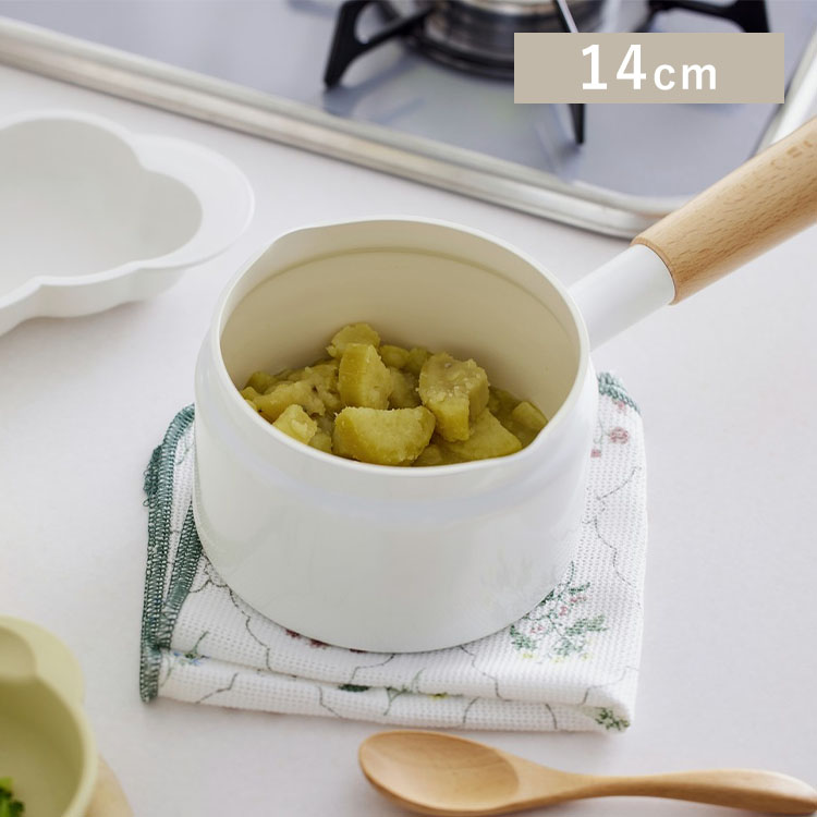【商品説明】手軽に使えるかわいいミルクパンです。あたたかみのあるデザインとくすみカラーでキッチンになじむ。キッチンに出しっぱなしにしたくなるミルクパン。手軽に使えるサイズ感。飲み物の温め以外にも、野菜の下ゆでや離乳食づくりなどちょっとした料理にちょうどいいいサイズ。「するん」が続く快適な使い心地のセラミックコーティング。食材がくっつきにくく、汚れもするっと落ちて気持ちいい。鍋の両端に注ぎ口があります。【商品仕様】【本体】●寸法14cm●満水容量1.3L●表面加工内側:セラミック塗装加工外側:シリコーン系樹脂焼付塗装加工(底面を除く)●材料の種類本体:アルミニウム合金はり底:ステンレス鋼(クロム16%)底の厚さ:3.5mm(はり底含む)ハンドル:天然木(ぶな)【ふた】●表面加工内側:セラミック塗装加工外側:シリコーン系樹脂焼付塗装加工(底面を除く)●材料の種類本体:アルミニウム合金つまみ:天然木(ぶな)●対応熱源IH200V、IH100V、ガス火、ラジエントヒーター、その他の電気ヒーター※電子レンジ・オーブン・食洗機では使用できません