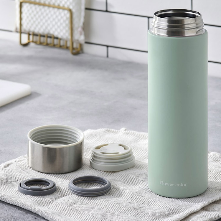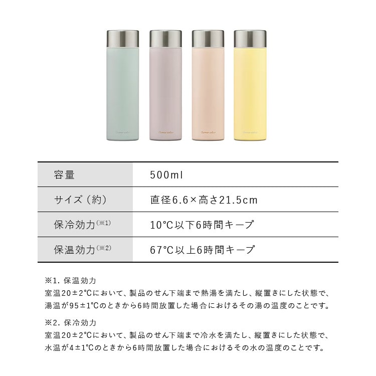 【商品説明】 ★スポーツドリンク対応★ くすみカラーのシンプルなステンレスマグボトルです。飲み口の口当たりを良くし、飲みやすい形状へ。飲みやすさがさらに向上しました。おいしい温度を6時間キープ可能。外びんと内びんの間の真空断熱層が温度をキープするので中の温度を逃がしにくく、外の熱を中に伝えにくい構造になっています。毎日使うアイテムだから、お手入れは簡単に。パーツを少なくして洗いやすく。しっかり洗えて衛生的です。シンプルデザインのやさしいくすみカラー。お出かけでもオフィスでも使う場所を選ばないデザインです。【商品仕様】●商品サイズ(cm)直径約6.6×高さ約20.53●質量約276g●実容量約0.5L●保温効力67度以上(6時間)●保冷効力10度以下(6時間)●材料の種類本体:ステンレス鋼(外側アクリル樹脂塗装)ふた:ポリプロピレン、ステンレス鋼飲み口:ポリプロピレンパッキン:シリコーン