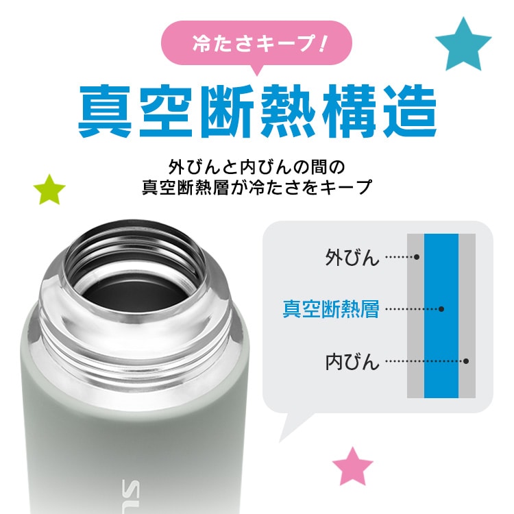 【商品説明】2025年7月14日 商品ページをリニューアルし、レッド・ブルーを削除致しました。 ★スポーツドリンク対応★ 毎日を楽しむキミに。 選べる4カラー ◆冷たさキープ!真空断熱構造 外びんと内びんの間の真空断熱層が冷たさをキープ。 6時間後も冷たくておいしい! 氷も入るので、部活動で氷を持ち運ぶのにも便利 ※製氷機で作られた氷を想定(約32mm×28mm×28mm) ◆漏れにくい!2段階ロック ロックリングを下げてからボタンを押すだけ。 バッグの中で不意に開いてしまうことを防ぐ。 簡単に開けられてスポーツする人にもピッタリ! ◆便利でうれしい!ポーチ付き 1.ハード底 底面部分は衝撃に強く、不意な落下でも安心。 2.ハンドベルト 持ち手にベルトが付いているので、お子様でも持ちやすい。 3.面ファスナー 面ファスナー付きで、出し入れしやすい。 4.洗える 洗濯機で洗えて、いつでも清潔。 ◆ラクラク!お手入れ 少ないパーツで洗いやすい。 ふたパッキンとせんパッキンは別途購入可能。 汚れが気になったときや破損したときもすぐに交換ができていつでも清潔! ●商品サイズ(cm) カバー込みサイズ:直径約9.5×高さ約30 ボトルサイズ:直径約8.1×高さ約29.5 ●質量 約590g ●材料の種類 内ビン:ステンレス鋼 胴部:ステンレス鋼 ふた:ポリプロピレン せん:ポリプロピレン パッキン:シリコーンゴム ●実容量 約1.0L ●保冷効力※ 9℃以下(6時間) ※ 保冷効力 室温20±2℃において、製品のせんユニット下端まで冷水を満たし、縦置きにした状態で、水温が4±1℃のときから6時間放置した場合におけるその水の温度のことです。