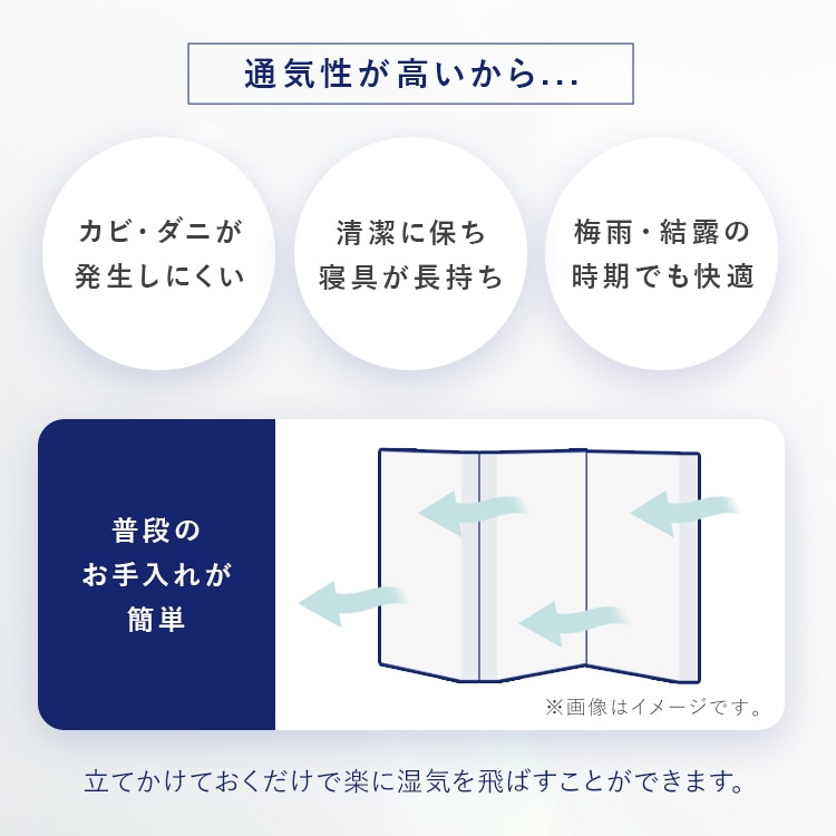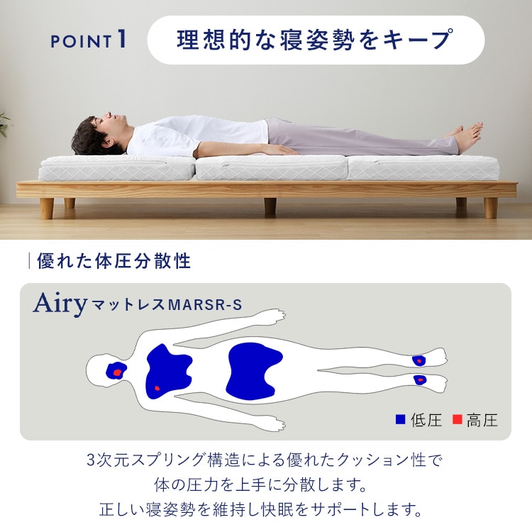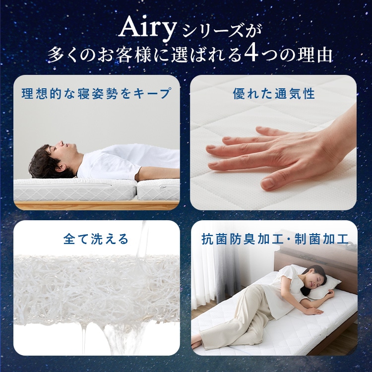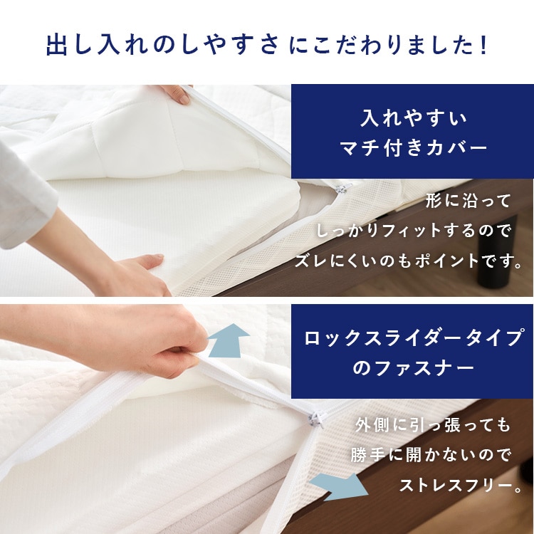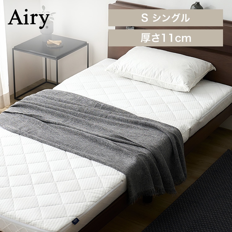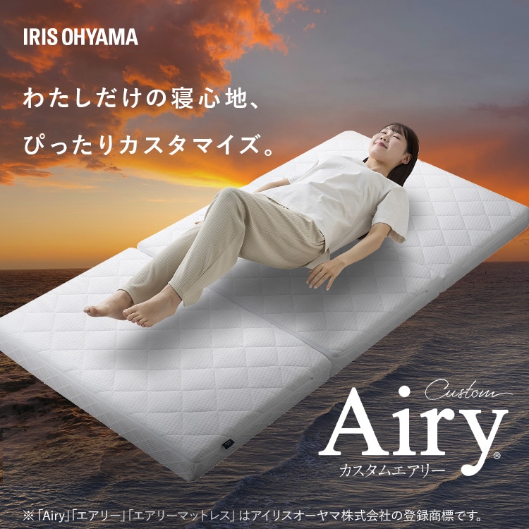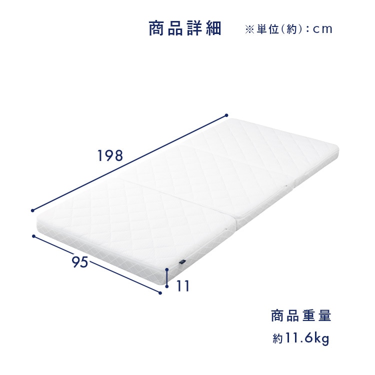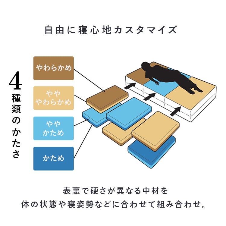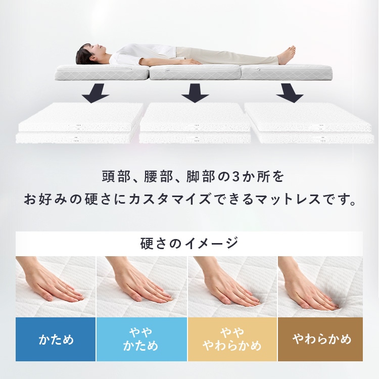 【商品説明】自由に寝心地をカスタマイズできるマットレス。表と裏でかたさが異なる2種類の「中材」×「頭部/腰部/脚部」の3か所を自由に組み合わせ可能。身体の状態や寝姿勢、好みに合わせて自分だけの寝心地を作れる。【高密度の三次元網状繊維構造体“エアロキューブ(R)”使用】芯材の中身が空洞の中空成形で、製品体積の95%が空気で構成されている素材。弾力性のある繊維が空気を編むように絡み合った“3次元スプリング構造”で適度なかたさ。体圧分散性・耐久性に優れ、新幹線のシートなど幅広く使用されている。【理想的な寝姿勢をキープ】優れたクッション性で体の圧力を分散し、正しい寝姿勢を維持しやすい。また高い反発力で、スムーズな寝返りを促す。【優れた通気性】「エアロキューブ(R)」は通気性が非常に高く、湿気を外に逃がしやすい。カビ・ダニが発生しにくく、梅雨や結露の時期でも快適。立てかけておくだけで湿気を飛ばせるから、普段のお手入れも簡単。【すべて洗える】カバーと中材を取り外して、丸ごと洗える。中材は3分割になっているから、汚れた部分だけ取り出して洗える。(※カバー:洗濯機/中材:水洗いが可能です。)【出し入れしやすい】・ロックスライダータイプのファスナー:外側に引っ張っても勝手に開きにくい。・入れやすいマチ付きカバー:カタチにそってしっかりフィットし、ズレにくい。・かたさネームタグ付き:中材の側生地と本体は目印になるかたさタグ付きでわかりやすい。【抗菌防臭加工・制菌加工】「エアロキューブ(R)」はSEK基準「抗菌防臭」と「制菌」をクリア。三次元網状繊維構造体だから繊維くずが出ず、ダニも繁殖しにくい。※エアロキューブ(R)は東洋紡エムシー株式会社の登録商標です。【商品仕様】●商品サイズ(cm)幅約95×長さ約198×厚さ約11(シングルサイズ)●商品重量約11.6kg●材質カバー:ポリエステル100%中材:合成繊維(ポリエーテルエステルエラストマー)●生産国側地:中国詰物:日本●洗濯表示(カバー)・液温は40℃を限度とし、洗濯機で非常に弱い洗濯処理ができる・酸素系漂白剤の使用はできるが、塩素系漂白剤は使用禁止・タンブル乾燥禁止・日陰のつり干しがよい・アイロン仕上げ禁止・ドライクリーニング禁止・非常に弱い操作によるウェットクリーニングができる※カバーを洗濯する際は、中材を取り出してください。※中材を洗う際は、カバーを外してシャワーや流水で水洗いしてください。洗濯機は使用しないでください。