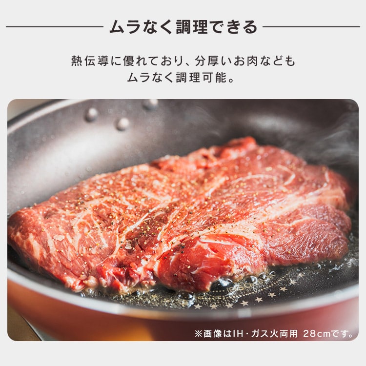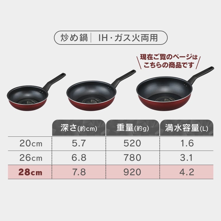 【商品説明】こびりつきにくく、丈夫で長持ち。ダイヤモンドコートパン【IH・ガス火両用】炒め鍋。◆するっと快適な使い心地ダイヤモンドコーティングでストレスフリーな料理時間を♪こびりつきにくいので、嫌な油汚れもラクラク落とせちゃう。◆ダイヤモンドコーティングとは?耐摩耗性を高めるダイヤモンド粒子をフッ素に配合したコーティングを使用しています。熱伝導に優れており、分厚いお肉などもムラなく調理可能。◆用途広がる炒め鍋炒め物はもちろん、汁気が多い料理や煮込み料理にも向いている!新たに登場した炒め鍋は、麺類の調理やちょっとした煮込み料理に便利♪◆一体型だから使いやすい取っ手が固定されていることで、頑丈でしっかりとした安定感!【商品仕様】※商品サイズの高さは取っ手迄のサイズを記載しております。●商品サイズ(cm)幅約48.2×奥行約29.7×高さ約11.2●質量約920g●満水容量約4.2L●寸法28cm●カラーワインレッド●表面加工内側:ふっ素樹脂塗膜加工外側:焼付塗装加工●材料の種類本体:アルミニウム合金ハンドル:アルミニウム合金、フェノール樹脂(耐熱温度150℃)はり底:ステンレス鋼(クロム16%)底の厚さ:2.7mm(はり底を含む)●対応熱源IH調理器、ガスコンロ、ラジエントヒーター※電子レンジ、オーブンでは使用できません。