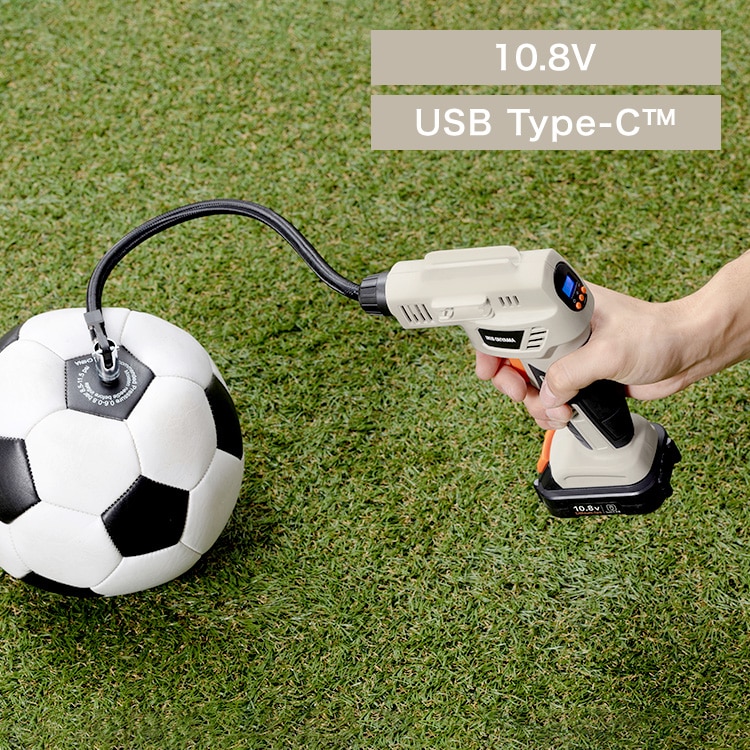【商品説明】DIYの強い味方充電式エアコンプレッサー 10.8VDIY初心者~中級者におすすめのエアコンプレッサー充電式なので様々なシーンで大活躍!◇自動車タイヤもOK!最大圧力約830kpa◇パワフル&スピード注入最大空気量8L/minで空気をスピード注入。自動車タイヤの空気入れにも使えるパワフルな性能。ノズルを差し込みトリガーを握るだけ。初心者でも簡単に空気を入れられます。◇空気圧測定&オートストップ機能空気圧をリアルタイムでチェック可能。数字表示が大きく見やすい。設定した圧力に達すると充填が自動で止まるオートストップ機能。空気の入れすぎによる破裂・破損を防ぎます。◇USB Type-C TM 充電USB Type-C TMケーブルからバッテリーに直接充電!専用の充電器は不要です。◇コードレス充電式なので、どこにでも持ち運んで使えます。コンセントのない屋外や高いところでの作業におすすめ。◇軽量な10.8V軽量約0.9kg※バッテリー含む【商品仕様】●定格電圧DC 10.8V●製品寸法(バッテリー含む)(cm)幅15.5×奥行6.5×高さ23.4●製品質量(バッテリー含む)約0.9kg●エアホース長さ390mm●最大作動圧力約8.3bar●連続運転時間約20分●最大送り込み空気量8L/min●付属品充電式リチウムイオンバッテリー(DBL1020C)×1個、USB充電ケーブル(Type-A to C)×1本、自転車用ノズル×1個、ボール用ノズル×1個、浮輪用ノズル×1個【バッテリー仕様】●製品寸法(cm)長さ約9.7×幅約6.5×高さ約4.8●製品質量約235g●電池種類リチウムイオン二次電池●電池電圧10.8V●電池容量2000mAh●充電方式USB Type-C TM●充電時間約130分(5V3A充電時*1)●USB入力電圧/入力電流DC5V/3A●使用温度0~40℃(充電時:5~35℃)*商品の仕様は予告なく変更することがあります。*USB Type-C TMはUSB Implementers Forumの商標です。PSマーク種類:PSE届出事業者名:アイリスオーヤマ株式会社<別売品>充電式リチウムイオンバッテリー(DBL1020C)