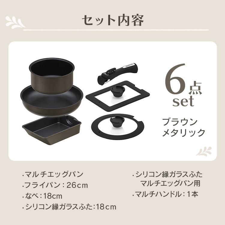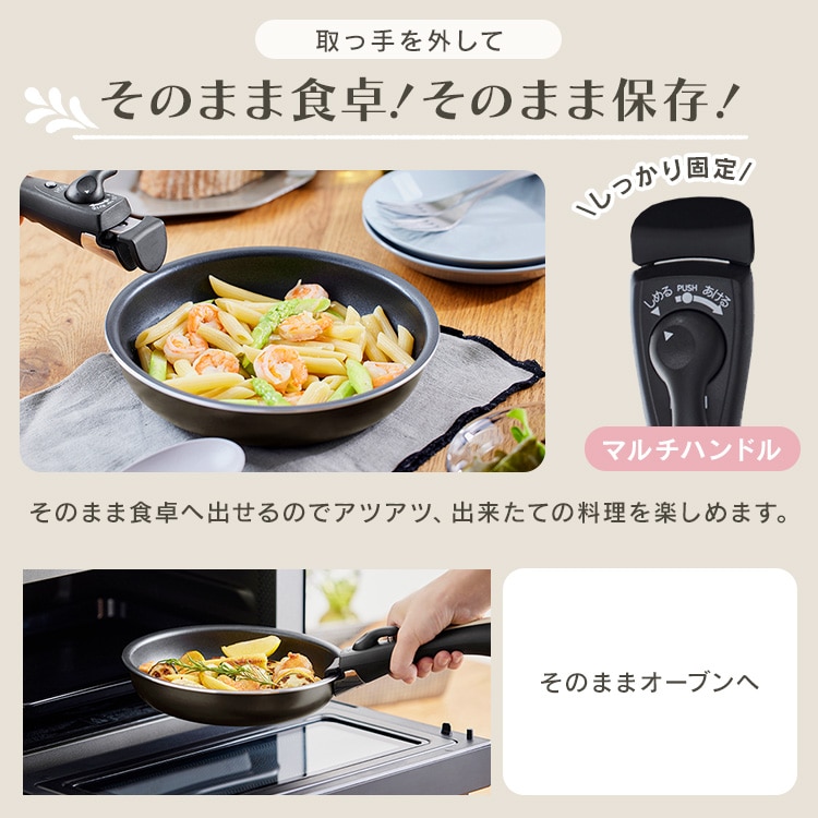 【商品説明】幅広・深型でマルチに使える「エッグパン」付きのダイヤモンドコートパンセットです。[IH(200V・100V)/ガス火]両用です。[食洗機/オーブン/グリル/ラジエントヒーター/その他の電気ヒーター]にも対応しています。(※電子レンジでは使用できません。)調理面の耐摩耗性を高める、ダイヤモンド粒子をフッ素に配合したコーティングを使用しています。コーティング効果でこびりつきにくく、汚れも落ちやすいので、洗い物の負担を軽減します。取っ手が外せるので、そのまま食卓へ出したり、保存することができます。ガラスふたにある溝には、菜箸やターナーなどを置けます。重ねて収納できるため、セットで購入しても整理しやすく、省スペースを実現できます。【商品仕様】●商品内容(6点セット)・なべ18cm・フライパン26cm・マルチエッグパン・マルチハンドル・シリコン縁ガラスふた×2(18cm/マルチエッグパン用)●寸法なべ:18cmフライパン:26cmマルチエッグパン:16×23cm●満水容量なべ:2.2Lフライパン:2.7Lマルチエッグパン:1.4L●材質、仕様【なべ、フライパン、マルチエッグパン】表面加工(内側/外側):フッ素樹脂塗膜加工/(底面を除く)焼付け塗装本体:アルミニウム合金はり底:ステンレス鋼(クロム16%)はり底を含む底の厚さ(なべ、フライパン/マルチエッグパン):2.6mm/5.3mm【マルチハンドル】材質の種類:ナイロン(耐熱温度:約200℃)、フェノール樹脂(耐熱温度:約160℃)金属部:ステンレス鋼(クロム18%、ニッケル8%)ゴム部:シリコーンゴム(耐熱温度:約230℃)【シリコン縁ガラスふた】品名:強化ガラス製器具強化の種類:全面物理強化ゴム部:シリコーンゴム(耐熱温度:約230℃)※必ず中火以下で、調理面には油をひいてご使用ください。※空だきはしないでください。※調理後の急激な冷却は避けてください。※金属製の調理器具のため電子レンジではご使用いただけません。