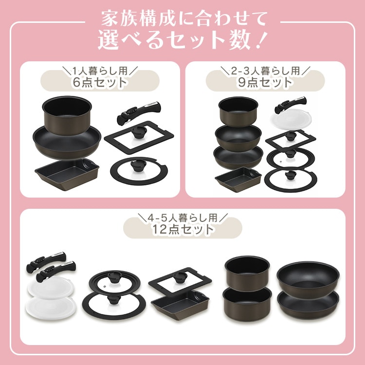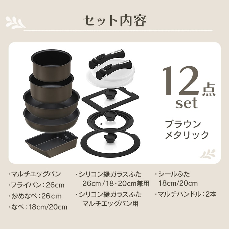 【商品説明】幅広・深型でマルチに使える「エッグパン」付きのダイヤモンドコートパンセットです。[IH(200V・100V)/ガス火]両用です。[食洗機/オーブン/グリル/ラジエントヒーター/その他の電気ヒーター]にも対応しています。(※電子レンジでは使用できません。)調理面の耐摩耗性を高める、ダイヤモンド粒子をフッ素に配合したコーティングを使用しています。コーティング効果でこびりつきにくく、汚れも落ちやすいので、洗い物の負担を軽減します。取っ手が外せるので、そのまま食卓へ出したり、保存することができます。ガラスふたにある溝には、菜箸やターナーなどを置けます。重ねて収納できるため、セットで購入しても整理しやすく、省スペースを実現できます。【商品仕様】●商品内容(12点セット)・なべ×2(18cm/20cm)・炒めなべ26cm・フライパン26cm・マルチエッグパン・マルチハンドル×2・シリコン縁ガラスふた×3(18・20cm兼用/26cm/マルチエッグパン用)・PEシールふた×2(18cm/20cm)●寸法なべ:18cm/20cm炒めなべ:26cmフライパン:26cmマルチエッグパン:16×23cm●満水容量なべ(18cm/20cm):2.2L/2.8L炒めなべ:3.5Lフライパン:2.7Lマルチエッグパン:1.4L●材質、仕様【なべ、炒めなべ、フライパン、マルチエッグパン】表面加工(内側/外側):フッ素樹脂塗膜加工/(底面を除く)焼付け塗装本体:アルミニウム合金はり底:ステンレス鋼(クロム16%)はり底を含む底の厚さ(なべ、炒めなべ、フライパン/マルチエッグパン):2.6mm/5.3mm【マルチハンドル】材質の種類:ナイロン(耐熱温度:約200℃)、フェノール樹脂(耐熱温度:約160℃)金属部:ステンレス鋼(クロム18%、ニッケル8%)ゴム部:シリコーンゴム(耐熱温度:約230℃)【シリコン縁ガラスふた】品名:強化ガラス製器具強化の種類:全面物理強化ゴム部:シリコーンゴム(耐熱温度:約230℃)【PEシールふた】原料樹脂:ポリエチレン耐熱温度:約80℃※必ず中火以下で、調理面には油をひいてご使用ください。※空だきはしないでください。※調理後の急激な冷却は避けてください。※金属製の調理器具のため電子レンジではご使用いただけません。