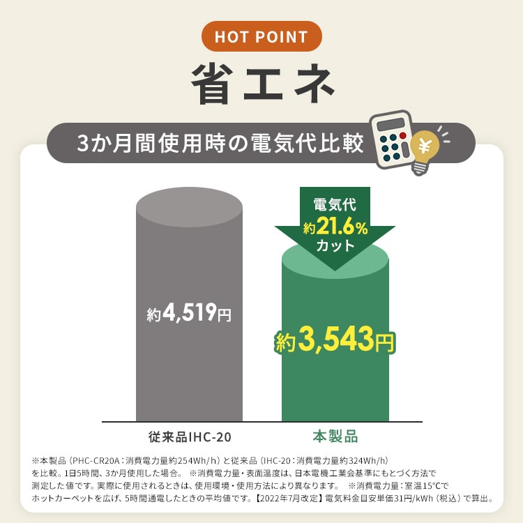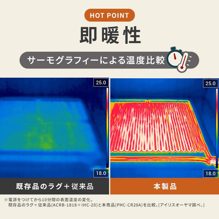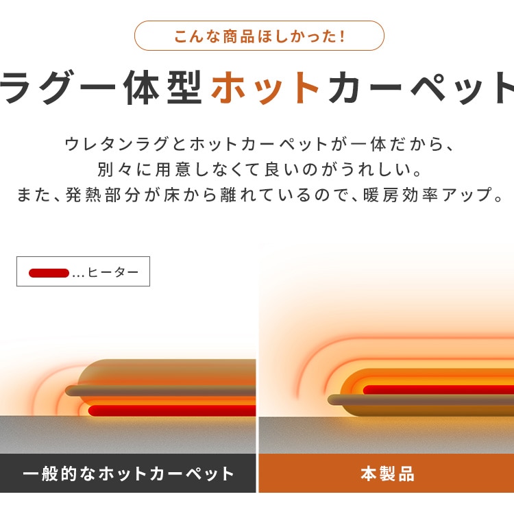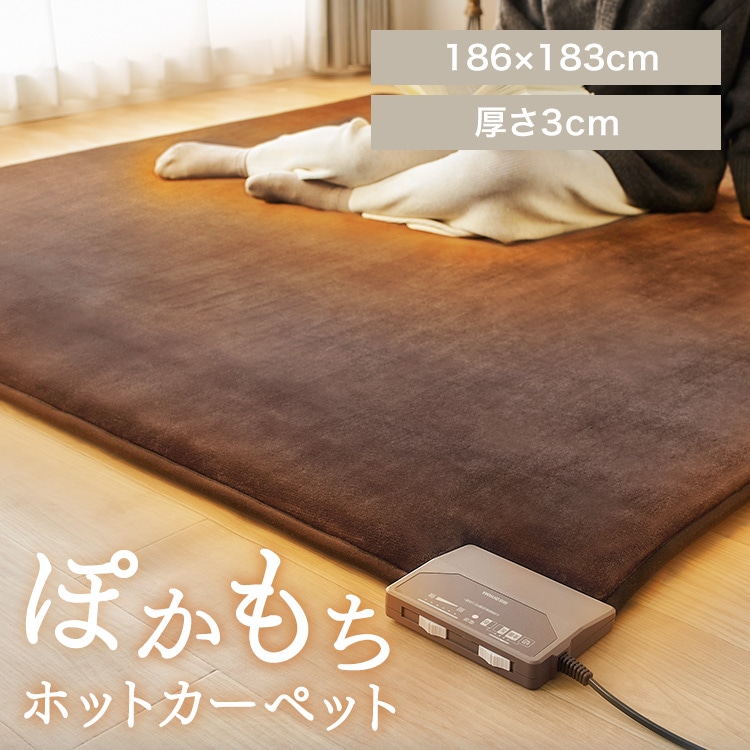 【商品説明】ぽかっと、もっちり。-たった1枚で作れるぬくもり空間-IRIS OHYAMA一体型ホットカーペットLa cushion HOT CARPET(ラ・クッション ホットカーペット)・ウレタン30mm・断熱効果・省エネ・微はっ水・すべり止めこんな商品ほしかった!一体型ホットカーペット。一体型にすることで暖房効果を最大化。また、底側にウレタンがあるので断熱効果も。こんな方におすすめ!・冬でも、床でぬくぬく過ごしたい。・暖房代は抑えたいけど、足元はしっかり暖めたい。・子どもが走り回って、ズレたりめくれたりするのが不安。・ペットと暮らしてるけど、毛や汚れのストレスは減らしたい。【HOT POINT】「からだも心も、ぽかっと。」◆即暖性 たった30分でぽかぽか!◆省エネ 電気代約21%カット※従来品IHC-20と本製品、3か月間使用時の電気代比較※本製品(PHC-CR20A:消費電力量約254Wh/W)と従来品(IHC-20:消費電力量約324Wh/h)と比較。1日5時間を2年間使用した場合。※消費電力量・表面温度は、日本機工業会基準にもとづく方法で測定した値です。実際に使用されるときは、使用環境・使用方法により異なります。※消費電力量:室温15℃での上にホットカーペットを広げ、5時間通電したときの平均値です。【2022年7月改定】電気料金目安単価31円/kWh(税込)で算出。◆暖房面切り替え機能暖房面をそえぞれ独立して暖めることができます。使用しない部分の暖めはカットできるので、無駄な電気代もかかりません。温度調節は無段階。好みに合わせて、細かい温度調節が可能。◆6時間タイマー機能スイッチを入れてから6時間後に自動で電源OFFに。もしもの切り忘れに安心です。【RUG POINT】「やみつきになる、もっちり。」◆ずっと触れていたいもちもち触感中材には弾力性のあるウレタンを使用。もっちりやみつきになる感覚です。柔らかなフランネル素材を使用。ずっと触っていたくなるような肌触りで心も体もリラックス。毛足が短いからゴミが入りにくく、掃除もラクラク。◆微はっ水加工うっかり飲み物をこぼしてもサッと拭き取るだけ。液体がしみこみにくいから、お手入れかんたん。◆優れた防音性遮音等級ΔLL(I)-9※※第三者機関にて検査実施。マンションなど階下への生活音が心配な方におすすめ。小さなお子さまがいるご家庭も、安心してお過ごしいただけます。◆すべり止め裏面にはすべり止め加工を施しているため、フローリングに敷いてもズレにくく快適。ラグのフチはしっかりと縫製。ほつれや破れが起きにくいので長くご愛用いただけます。【商品仕様】●商品サイズ(cm)本体:幅約186×奥行約183操作部除くホットカーペットサイズ:幅約182×奥行約182●質量約5.1kg●電源コード長さ約1.5m●電源AC100V、50/60Hz●定格消費電力530W●表面材質ポリエステル100%●カラーグレー、ブラウン