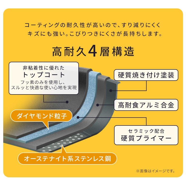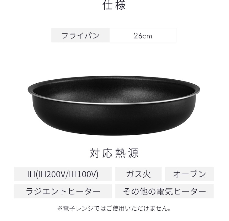 【商品説明】ダイヤモンドコーティングを使用したフライパンです。IH・ガス火対応/食洗機対応/PFOA・PFOS不使用ダイヤモンドコーティングとは、人工ダイヤモンドを細かい粒子状にしてふっ素樹脂コーティングに配合したものです。汚れが落ちやすいため、お手入れが簡単です。調理後はハンドルを外し、お皿として食卓へ並べられます。ハンドルをはずしてお皿のように丸洗いが出来ます。使用しないときは重ねて省スペースで収納できます。有害物質(PFOA/PFOS)不使用の塗料を使用しているため、安心してお使いいただけます。食洗機対応です(中性洗剤の使用に限ります)。ハンドルは別売となります。ガス火・IHに対応しています。オーブンでも使用できます(※マルチハンドルは外してご使用ください)。【商品仕様】●商品サイズ(cm)直径約27.8×高さ約6●重量約560g●寸法約26cm●満水容量約2.7L●表面加工内側:ふっ素樹脂塗膜加工外側:(底面を除く)焼付け塗装●材料の種類本体:アルミニウム合金はり底:ステンレス鋼(クロム16%)底の厚さ:2.6mm(はり底を含む)●対応熱源IH200V、IH100V、ガス火、ラジエントヒーター、オーブン、その他の電源ヒーター※電子レンジでは使用できません。