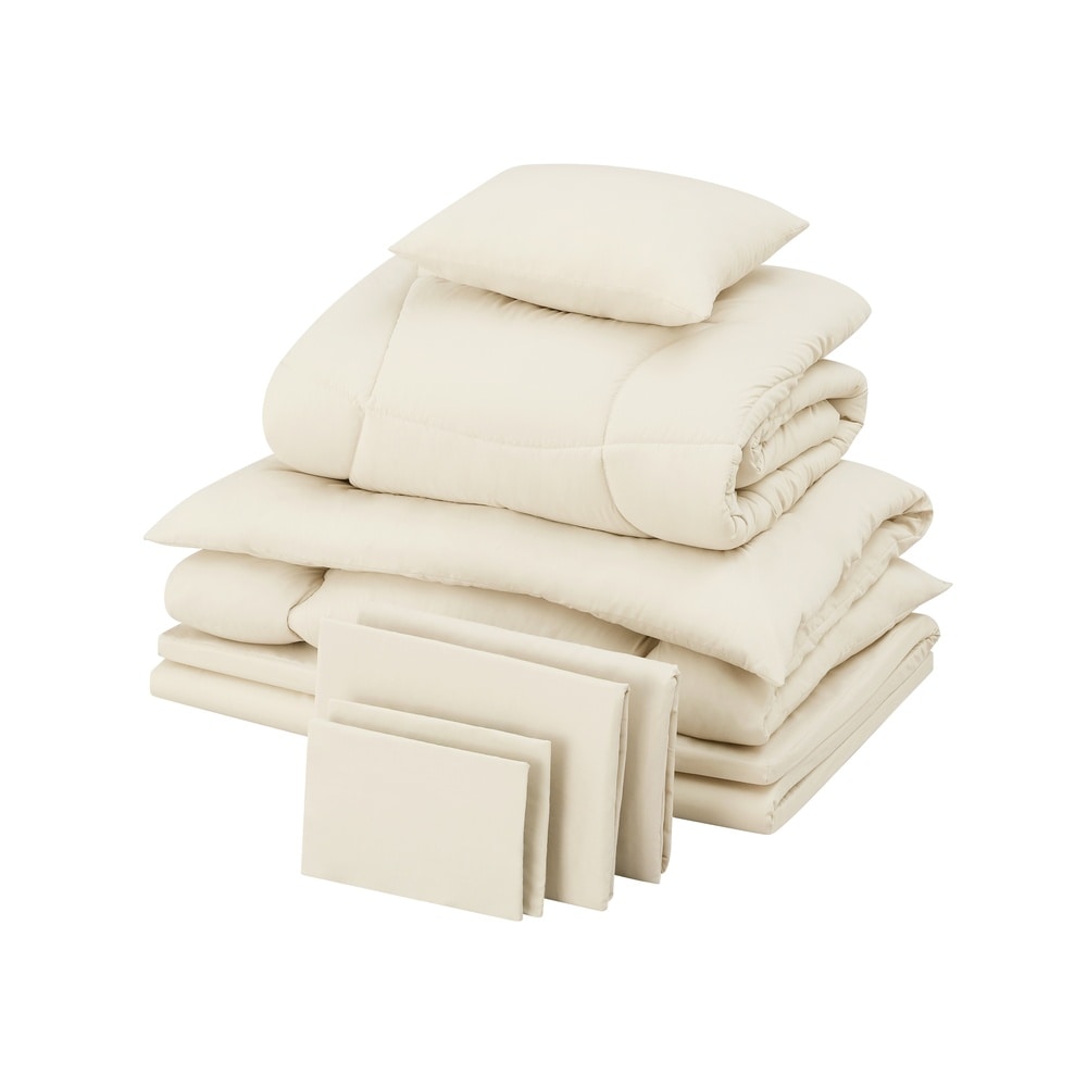 【商品説明】マットレス付きの布団9点セットです。カバーも付属されていて、これ1つあれば安心のフルセットです。掛け布団の中わたは中空ポリエステルわたで、ふんわり軽くあたたかいです。敷き布団はふんわりしたやわらかさで、包み込まれるような寝心地です。マットレスは底付き感を軽減し、程よい硬さで沈み込みを抑え、快適な寝心地をサポートします。マットレスと敷き布団の合わせ使いでさらに快適な寝心地となります。枕は後頭部から首筋までふんわりやさしく包み込みます。ボックスシーツは全周にゴムがついているので、マットレスと敷き布団をまとめて覆うことができ、着脱が簡単に行えます。ご自宅の洗濯機で洗えます(洗濯ネットの使用をおすすめします)。家庭用の乾燥機対応です。マットレスは洗えません。定期的に裏返したり、陰干しにするなどのお手入れをしてください。ピーチスキン加工で柔らかくなめらかな肌触りです。低ホルムアルデヒドで、安心の品質です。収納に便利なバッグ付きです。圧縮梱包してあるので、持ち帰りや搬入が簡単です。【商品仕様】●シングルサイズ●セット内容掛け布団、敷き布団、枕、掛け布団カバー、ボックスシーツ、枕カバー2枚、マットレス、収納バッグ【掛け布団】●商品サイズ(cm)幅約150×奥行約210●質量約1.5kg●詰め物重量約1kg●ループ数6か所【敷き布団】●商品サイズ(cm)幅約95×奥行約198●質量約2.1kg●詰め物重量約1.8kg【枕】●商品サイズ(cm)幅約50×奥行約35●質量約400g●詰め物重量約350g【掛け布団、敷き布団、枕 共通】●主要材質側生地:ポリエステル100%詰めもの:ポリエステル100%●洗濯表示洗濯機(弱):30℃まで洗濯ネットを使用する漂白、乾燥機、アイロン:禁止ドライクリーニング可能【掛け布団カバー】●商品サイズ(cm)幅約150×奥行約210●質量約550g●カバー取り付けひも6か所【ボックスシーツ】●商品サイズ(cm)幅約95×奥行約198×高さ約25●質量約300g●厚さ約25cmまでのマットレスに対応【枕カバー】●商品サイズ(cm)幅約50×奥行約35●質量約50g●ファスナー付き【掛け布団カバー、ボックスシーツ、枕カバー 共通】●主要材質側生地:ポリエステル100%●洗濯表示洗濯機(弱):40℃まで洗濯ネットを使用する漂白:禁止乾燥機使用可:乾燥機を使用する(低温)アイロン使用可:アイロンをかける(低温)ドライクリーニング可能【マットレス】●商品サイズ(cm)幅約95×奥行約198×高さ約3●質量約1.46kg●主要材質側生地:ポリエステル100%詰めもの:ウレタンフォーム●洗濯不可【収納バッグ】●商品サイズ(cm)幅約100×奥行約70×高さ約35●質量約250g●主要材質不織布