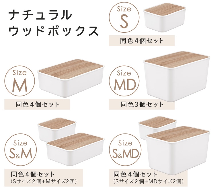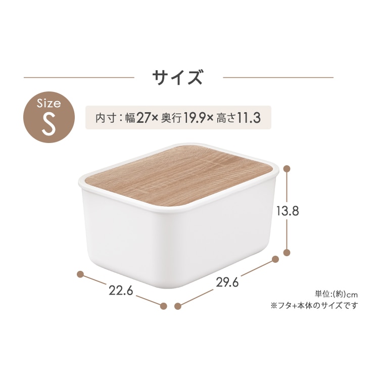 【商品説明】すっきり隠してオシャレに収納。木目調デザインのフタがアクセントにシンプルで使いやすい収納ケース。◆あたたかみのあるシンプルなデザインナチュラルな木目調でお部屋に合わせやすく使いやすい。◆中身を隠してすっきり収納、天板にもなるフラットなフタ付きホコリを防ぎ天板にもなるフラットなフタ。生活感を隠してすっきりとした統一感を演出します。フタには水に強いPVCシートを使用。汚れてもサッと拭き取ることができ、洗面所などの水回りでも活躍できます。フタの裏側にツメがついているので、ズレることなくピッタリと本体にはまります。積み重ねは最大2個まで可能です。使用頻度の高い日用品もすっきりまとめて収納。シーンに合わせて選べる3サイズ×2カラー。アイリスオーヤマのメタルラックにぴったりのサイズ。【商品仕様】●商品サイズ(cm)Sサイズ:NWB-29 外寸:幅約29.6×奥行約22.6×高さ約13.8 内寸:幅約27×奥行約19.9×高さ約11.3 重量:約549gMサイズ:NWB-45 外寸:幅約45.3×奥行約29.8×高さ約13.8 内寸:幅約43×奥行約27×高さ約11.3 重量:約860gMDサイズ:NWB-45D 外寸:幅約45.3×奥行約29.8×高さ約25.5 内寸:幅約42×奥行約26×高さ約23 重量:約1.13kg●材質ポリプロピレン、合成樹脂化粧繊維板(塩化ビニル樹脂)、ポリエチレン●セット内容Sサイズ4個、Mサイズ4個、MDサイズ3個、Mサイズ2個+Sサイズ2個、MDサイズ2個+Sサイズ2個●カラーホワイト、ダークグレー