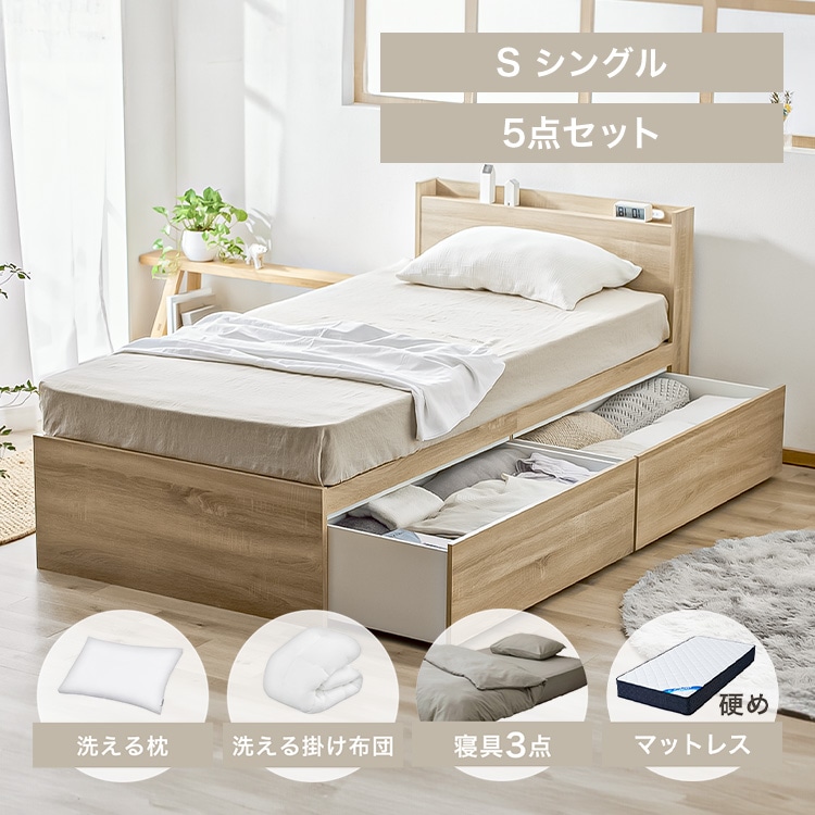 【商品説明】「収納量」にこだわりをもった、引き出し付の大容量収納ベッド。ワンルームなどで収納スペースがあまりない方や、お部屋をスッキリ見せたい方にもおすすめ。引き出しはキャスター付きでスムーズに開閉できます。引き出し側でないフリースペースはスーツケースや布団など、季節ものの収納に使えます。ヘッドボードには2口コンセント付。携帯等の充電に便利です。棚スペースには目覚まし時計等の小物を置くことができます。通気性に優れたすのこ構造で、湿気を逃がします。★お客様組立★【商品仕様】【ベッド本体】●商品サイズ(cm)幅約97.2×奥行約210.3×高さ約80●商品重量約62.75kg●耐荷重ヘッドボード天板:約5kg、本体:約100kg、引出:約10kg(1個あたり)、全体:約125kg●主要材質プリント紙化粧パーティクルボード、プリント紙化粧繊維板●電源コード仕様定格電圧:AC100V定格周波数:50Hz/60Hz消費電力合計:1500Wまで※2人以上での組み立てをおすすめします。※耐荷重は測定値であり、保証値ではありません。【マットレス:厚さ20cmタイプ】●かたさ:ふつう●商品サイズ(cm)(シングル)幅約97×奥行約195×高さ約20●製品質量約19.25kg~●構造一体式●主要材質コイルスプリング、ウレタンフォーム、ポリエステル【マットレス:かため厚さ21cmタイプ】●かたさ:かため●商品サイズ(cm)幅約97×奥行約195×高さ約21●質量約23kg●材料コイルスプリング(詰物:ウレタンフォーム、フェルト(ポリエステル)、不織布(ポリプロピレン))●外装生地の組成表生地:ポリエステル100%裏生地:ポリプロピレン100%