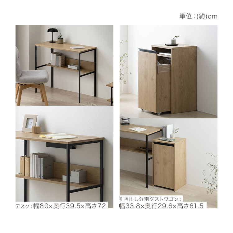 【商品説明】【リビングデスク HLVD-800 ナチュラル/ブラック】理想のお部屋を叶えるHIRO BIRO シリーズ最大のポイントは奥行スリム×収納部屋を広く使える、スリムな奥行。ちょっとした小物を置ける棚付き。背板があるため、書籍も置くことも。また、コンセントトレイ+コードスリット付きなので、配線もすっきりきれいにまとめられます。パソコン作業や勉強のスペースは十分に確保しつつ、お部屋の邪魔にはならないコンパクト設計。狭くなりがちな子供部屋でも使いやすい。木目調と黒で、引き締まった落ち着きのある印象に。★お客様組立★【引き出し分別ダストワゴン HDW-350 ナチュラル/ブラック】理想のお部屋を叶えるHIRO BIRO シリーズ最大のポイントは目隠し×収納お部屋になじむ木目調デザイン。ゴミ箱に見えない、隠せる収納で生活感をなくし、スタイリッシュに。◆袋をかけるだけのラクラク設計ゴミ袋やレジ袋をかけるだけでOK。ゴミ箱が汚れたり、臭いが付きにくいので洗う手間もありません。◆一台二役ゴミ袋のかけ方次第で一台二役。大きい袋をかけることも、2つかけて分別することもできます。◆キャスター付きキャスター付きで楽に引き出せます。掃除もしやすくストレスフリー。◆ゴミ箱に見えない、魅せる収納生活感が出やすいゴミ箱を隠すことで、お部屋にインテリアをプラス。天板にちょっとした小物や観葉植物を飾ることもできます。ワゴン内にはゴミ袋を収納できる棚板付き。メラミン加工を施した天板は水や傷、熱に強く安心の使い心地。木目調と黒で、引き締まった落ち着きのある印象に。★お客様組立★【商品仕様】【リビングデスク HLVD-800 ナチュラル/ブラック】●商品サイズ(cm)幅約80.0×奥行約39.5×高さ約72.0●質量8.22kg●耐荷重天板:約20kg棚板:約5kg全体:約25kg●主要材質木製部分:プリント紙化粧パーティクルボードパイプ部品:金属(鋼)(エポキシ樹脂塗装)●必要工具+ドライバー(サイズ:2番)電動ドライバーの使用可※インパクトドライバーは使用しないでください。※耐荷重は測定値であり、保証値ではありません。※商品の仕様は予告なく変更する場合があります。【引き出し分別ダストワゴン HDW-350 ナチュラル/ブラック】●商品サイズ(cm)幅約33.8×奥行約29.6×高さ約61.5●耐荷重天板:約5kg棚板:約3kgワゴン:約5kg全体:約13kg●主要材質木製部:合成樹脂化粧パーティクルボード(メラミン樹脂)、プリント紙化粧パーティクルボード、プリント紙化粧繊維板金属部:金属(鋼)(エポキシ樹脂塗装)●質量約9.85kg●必要工具+ドライバー(サイズ:2番)電動ドライバーの使用可※インパクトドライバーは使用しないでください。※耐荷重は測定値であり、保証値ではありません。※商品の仕様は予告なく変更することがあります。