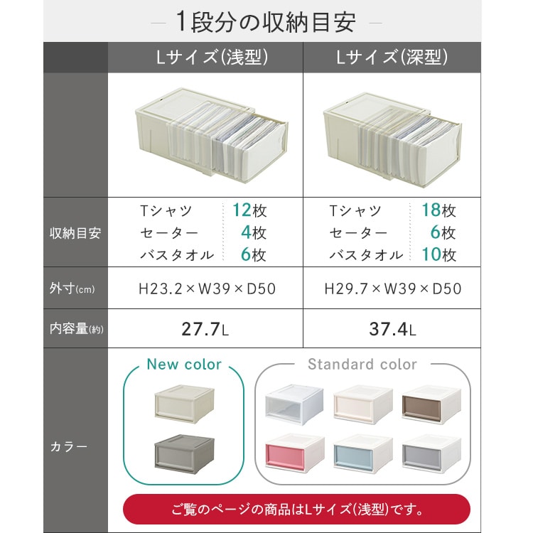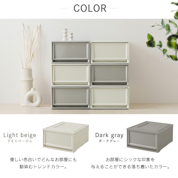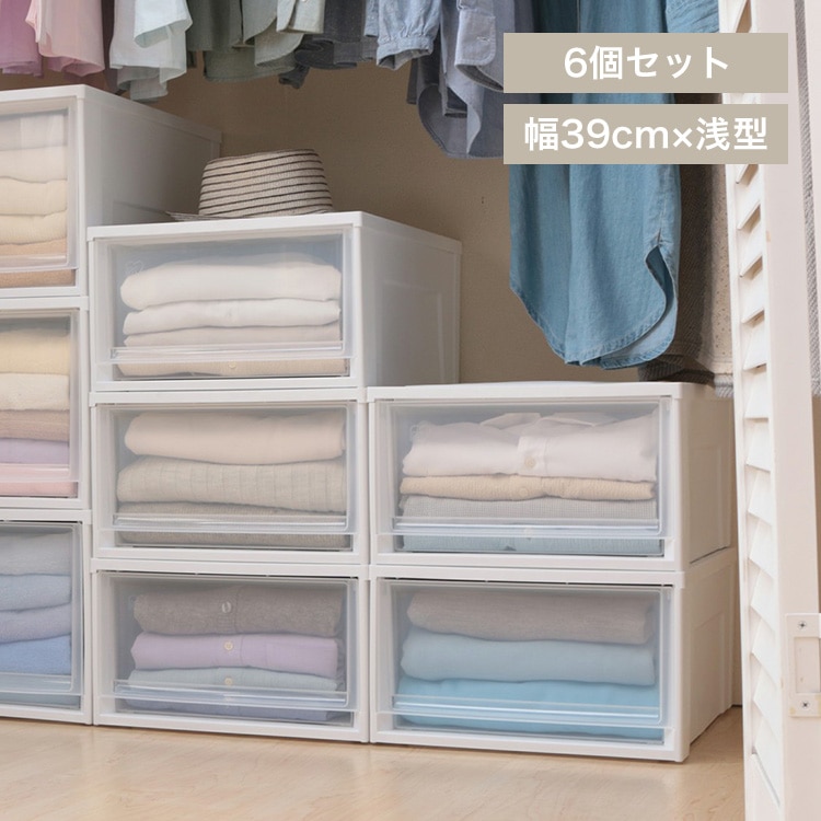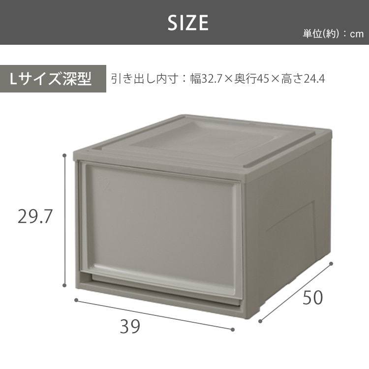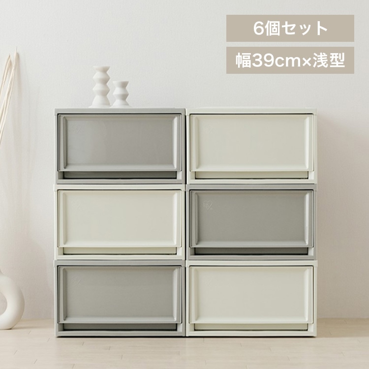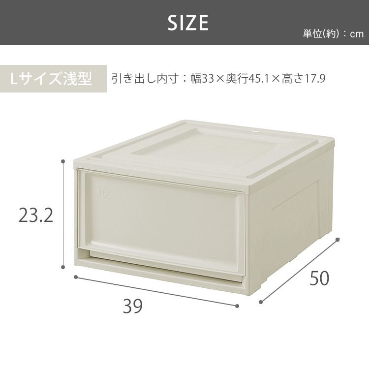 【商品説明】●2025年1月15日リニューアルしました!・カラー:ピンクベージュ/ブルーグレーを追加BCチェスト/組み立て不要/たっぷり収納好みの色に合わせて収納をカスタマイズ◆クローゼットにピッタリ収まる浅型/Lサイズ 奥行約50cmクローゼットの平均的な奥行は約45~60cm。BCチェストは奥行約50cmと、ちょうど良いサイズ感。◆積み重ねて収納力を大幅UP3段まで積み重ねて使用可能。ハンガー下のスペースも有効活用できます。◆ベッド下収納にもおすすめ落ち着いたカラーで生活感を抑えつつ、デッドスペースを有効活用。【商品仕様】●セット数6個セット●商品サイズ(cm)幅約39×奥行約50×高さ約23.2●引出内寸(cm)幅約33×奥行約45.0×高さ約17.9●内容量約27.7L●主要材質ポリプロピレン●収納の目安Tシャツなら12枚、セーターなら4枚、バスタオルなら6枚