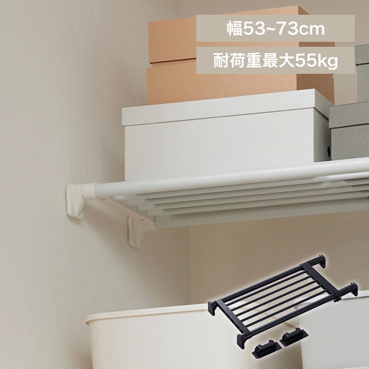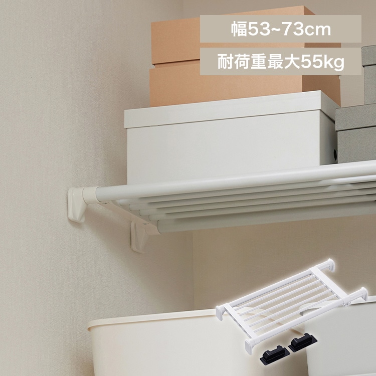 【商品説明】隙間もムダ無く使って、デッドスペースを有効活用!ネジやクギを使わずに壁にしっかり固定。さまざまな場所に取り付けられる、強力伸縮棚。【L字型圧着部を採用】圧着部をL字型にすることで十分な耐荷重を実現。【段差のある壁にも取り付けOK】ポールがそれぞれ自由に伸縮するので、段差のある壁にも取り付け可能。【取り付け簡単】取り付け時に位置を固定できるアダプター付きで、1人でも楽に取り付けできる。1.取り付け位置を決め、アダプターを壁に固定。(付属の台紙を使い、高さを合わせる。)2.伸縮しない側の圧着板をアダプターに乗せてパイプを伸縮させ、もう片方の圧着板を壁面に当てる。3.ロックネジを締めてパイプを固定し、アジャスターを回してパイプを突っ張る。4.アダプターを外して設置完了!(※壁紙に両面テープが残っている場合は、水で濡らすと簡単に剥がれます。)【商品仕様】●商品サイズ(cm)幅約53~73×奥行約24.8×高さ約5.5●商品重量約1kg●参考耐荷重(取付幅ごと)約53cmの場合(最小幅):約55kg約73cmの場合(最大幅):約30kg※耐荷重は測定値であり、保証値ではありません。●主要材質パイプ:鋼(塩化ビニル樹脂)樹脂部:ABS樹脂、EVA樹脂ねじ類:鋼(めっき)