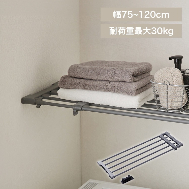 【商品説明】デッドスペースを有効活用!ネジやクギを使わずに壁にしっかり固定。さまざまな場所に取り付けられる、伸縮棚。【端まで使える伸縮棚】しっかりした作りで十分な耐荷重。伸ばした先まで棚として使えるのが魅力。【ひとりでも取り付けカンタン】伸縮棒を支えてくれるアダプター付き。ひとりでも取り付けラクラク。1.アダプターを設置して伸縮させる。(伸縮しない側の圧着板アダプターに乗せる。)2.ネジを締めてパイプを固定。3.設置完了!(※壁紙に両面テープが残っている場合は、水で濡らすと簡単に剥がれます。)【使い方いろいろ】・ランドリーに:洗濯機上などのデッドスペースを収納に。洗剤やタオルなども乗せられる。・キッチンに:小物が多く乱雑になりがちな台所も、棚があればスッキリ。【商品仕様】●商品サイズ(cm)幅約75~120×奥行約26×高さ約2.2●商品重量約930g●参考耐荷重(取付幅ごと)約75cmの場合(最小幅):約30kg約120cmの場合(最大幅):約15kg※耐荷重は測定値であり、保証値ではありません。●主要材質パイプ:鋼(塩化ビニル樹脂)樹脂部:ポリプロピレン、ABS樹脂、EVA樹脂ねじ類:鋼(めっき)