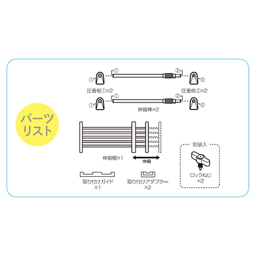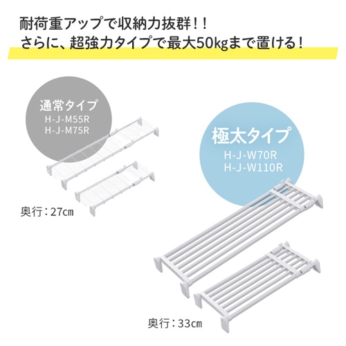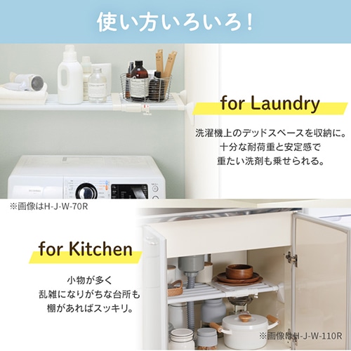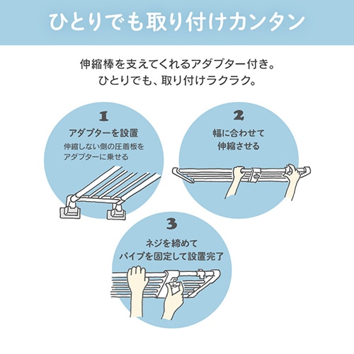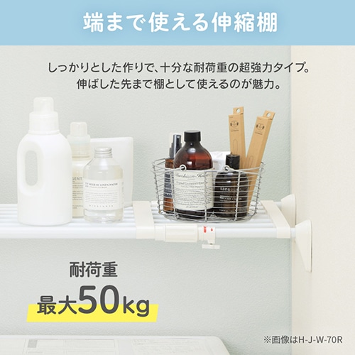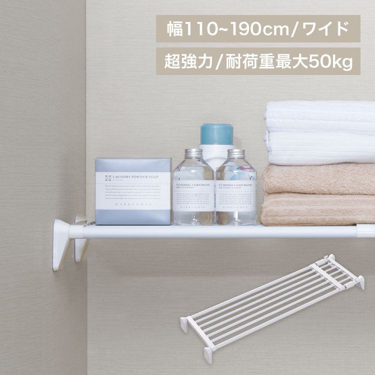 【商品説明】好きなところにワイドな幅で収納を。1人でも簡単に取り付けられる、超強力伸縮。【端まで使える伸縮棚】しっかりした作りで十分な耐荷重。伸ばした先まで棚として使えるのが魅力。【L字型で安定感UP】圧着部分をL字型にすることで、しっかり支えられるから安定感UP。左右で長さを変えての設置もOKなので、段差のある壁にも対応。【ひとりでも取り付けカンタン】伸縮棒を支えてくれるアダプター付き。ひとりでも取り付けラクラク。1.アダプターを設置して伸縮させる。(伸縮しない側の圧着板アダプターに乗せる。)2.ネジを締めてパイプを固定。3.設置完了!(※壁紙に両面テープが残っている場合は、水で濡らすと簡単に剥がれます。)【使い方いろいろ】・ランドリーに:洗濯機上などのデッドスペースを収納に。洗剤やタオルなども乗せられる。・キッチンに:小物が多く乱雑になりがちな台所も、棚があればスッキリ。【商品仕様】●商品サイズ(cm)幅約110~190×奥行約33×高さ約9.5●商品重量約3kg●参考耐荷重(取付幅ごと)約110cmの場合(最小幅):約50kg約190cmの場合(最大幅):約20kg※耐荷重は測定値であり、保証値ではありません。●主要材質パイプ:鋼(塩化ビニル樹脂)樹脂部:ABS樹脂、EVA樹脂ねじ類:鋼(めっき)