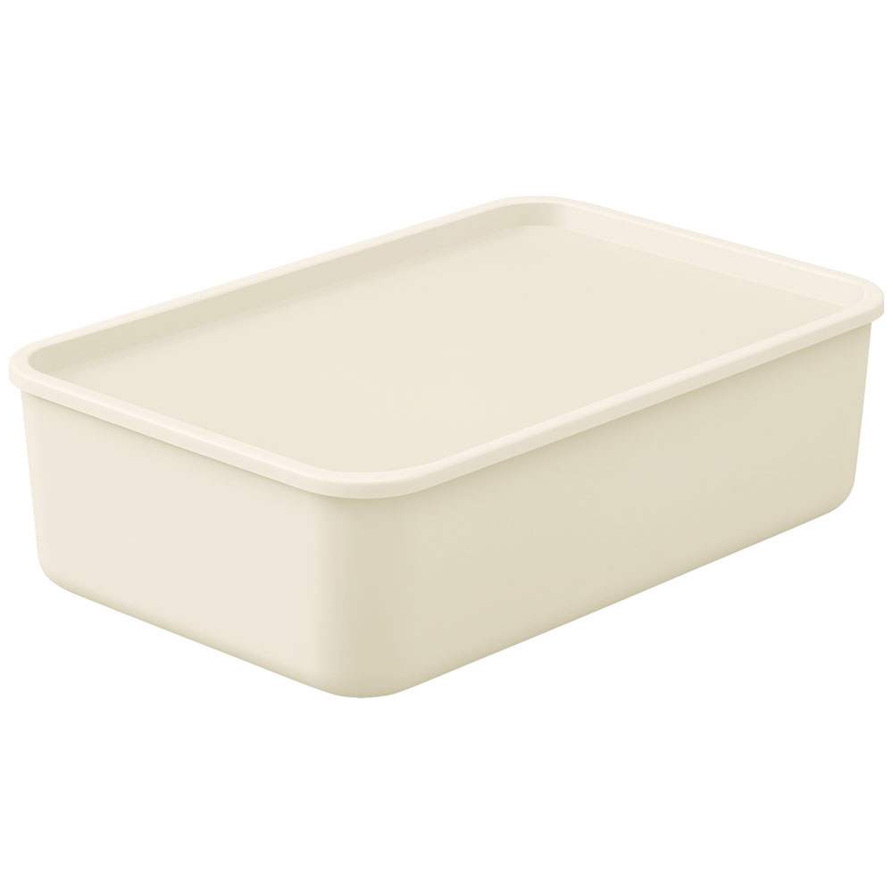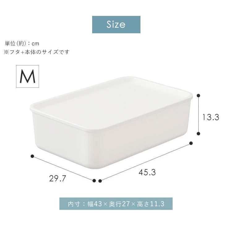 【商品説明】シンプルで丸みのあるやわらかなデザインのフタ付き積み重ねBOX。フタにふちがあるので、積み重ねてもズレにくい。中身を隠してホコリを防ぐフタは、上に小物を置いてトレーとして使用しても◎。衣類、鞄、おもちゃなどもスマートに整理整頓できて、お部屋をスッキリした印象に。汚れても丸洗いができるプラスチック製だから、キッチンや洗面所などの水回りにもオススメ。ご家庭はもちろんオフィスなど、幅広いシーンで使用できる。【商品仕様】●型番FTB-45(Mサイズ)●商品サイズ(cm)外寸:幅約45.3×奥行約29.7×高さ約13.3内寸:幅約43×奥行約27×高さ約11.3●商品質量約676g●主要材質ポリプロピレン