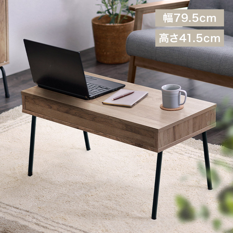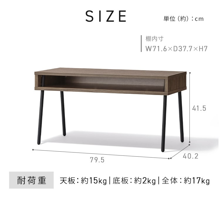 【商品説明】【スペパシリーズ】スリムでコンパクトな家具・家電だからスペースパフォーマンスが高い!理想のお部屋を叶えるHIRO BIRO シリーズ最大のポイントは…奥行スリム×収納◆収納付き本やリモコン、ちょっとした小物を収納できる。◆ちょうどいい天板サイズパソコンやノートなどを置いても余裕のスペース!◆圧迫感を感じさせないロースタイルパソコンを開いて作業したり、雑誌を読みながら食事をしたり。コンパクトで使いやすいこだわりのサイズ。◆憧れとこだわりの詰まったデザイン木目調と黒で、引き締まった落ち着きのある印象に。★お客様組立★【商品仕様】●製品サイズ(cm)外寸:幅約79.5×奥行約40.2×高さ約41.5収納棚内寸:幅約71.6×奥行約37.7×高さ約7●耐荷重天板:約15kg底板:約2kg全体:約17kg※耐荷重は測定値であり、保証値ではありません。●製品質量約7.9kg●主要材質木製部分:合成樹脂化粧繊維板(メラミン樹脂)、プリント紙化粧パーティクルボード脚部分:金属(鋼)(塗装:エポキシ樹脂塗装)●必要工具+ドライバー(サイズ:2番)※電動ドライバー使用可能。※インパクトドライバーは使用しないでください。※2人での組み立てをおすすめします。