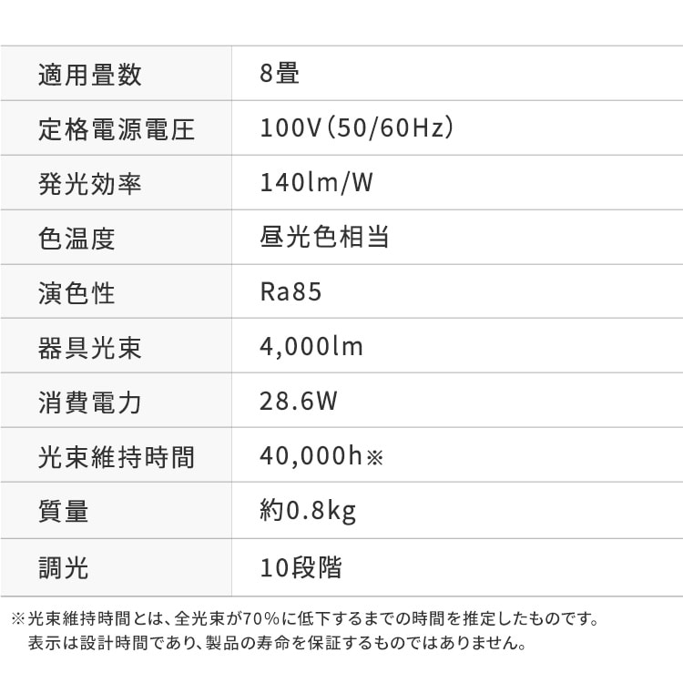【商品説明】無理のない節電が、ていねいな暮らしに繋がる。◆LEDに換えるだけで電気代が約半分に!蛍光灯とLEDシーリングライト10年間の電気代比較。10年間で約27649円お得。※電気料金は1日5.5時間使用した場合で計算。電気料金目安単価31円/kWh(税込)で算出。※丸型蛍光灯72形(消費電力:68W)と7.0シリーズ6畳用(消費電力:23.6W)を比較。◆さらに7.0シリーズなら!「節電モード」と「効率よく発光」の Wで節電1.節電モードで節電30分かけて明るさを徐々に落とし、気付かないうちに節電。※ゆっくり明るさが変わる場合、人間の目は変わっていく明るさに順応し変化を感じない性質があります。2.効率よく発光アイリスオーヤマ独自の技術で、明るさはそのままに高い省エネ性能を実現。◆工具不要で簡単2STEP取付お使いの照明と取り替えるだけ。1.ガチャっと回す2.シェードを付ける天井に下記の配線器具が付いていれば、すぐに取り付けできます。角型引掛シーリング丸型引掛シーリング丸型フル引掛シーリングフル引掛ローゼット ※天井からの出しろ:20mm以上、24mm未満埋込ローゼット(耳つき)(耳なし) ※天井からの出しろ:10mm以上、14mm未満◆明るさ切り替え10段階様々なシーンに合わせて調節できる。デスクワーク、くつろぎの時間、就寝◆より自然に見えるRa85演色性が高いほど、肌や食べ物の色がより美しく自然に見えます。住宅の屋内照明の場合、Ra80以上が好ましいとされています。◆便利なポイントメモリ点灯機能:お好みの明るさを記憶して再点灯。おやすみタイマー:次第に暗くなり30分後に消灯。【商品仕様】●商品サイズ(cm)直径約39.3×高さ約8.5●本体質量約0.81kg●適用畳数~8畳●型番CEP8D-7.0●色温度6500K(昼光色相当)●演色性Ra85●調光10段階●調色無し●ラストメモリー〇●壁スイッチ切替常夜灯→ラストメモリ点灯→全灯→●常夜灯明るさ2段階●おやすみタイマー30min●その他機能2CH切替、節電モード、デモモード●定格電圧AC100V●定格周波数50/60Hz●発光効率140Im/W●待機消費電力0.5W●使用環境温度5~35℃●光束維持時間40000h光束維持時間とは、全光束が70%に低下するまでの時間を推定したものです。表示は設計時間であり、製品の寿命を保証するものではありません。●定格消費電力28.6W●定格入力電流0.54A●器具光束(最大点灯時)4000lm●付属品・リモコン付属部品:リモコン、リモコンホルダー、単4形アルカリ乾電池×1本(お試し用)、タッピングネジ×2本・取り付け用付属品:スペーサー(角)(丸)●保証期間5年