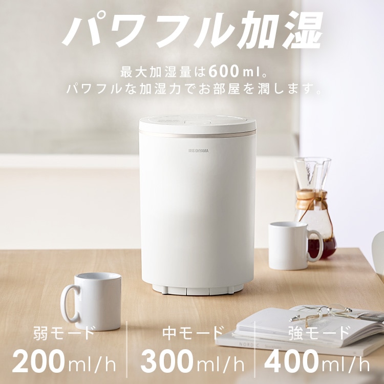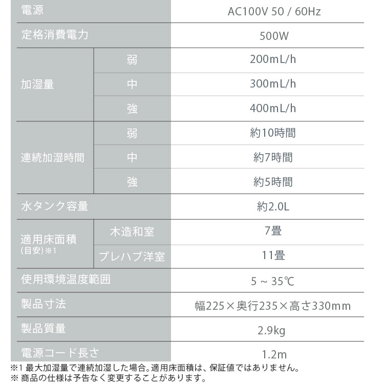 【商品説明】パワフルな加湿力と、フィルターレスでお手入れがしやすいスチーム式加湿器です。ヒーターを使って蒸気を放出するため、菌が繁殖しにくく衛生的です。水・蒸気が通るところはすべて丸洗い可能です。分解して隅々までお手入れができます。水タンクは汚れが落ちやすいフッ素樹脂加工で、家庭用のスポンジで手軽に洗えます。(※2ヵ月に1度、クエン酸洗浄を推奨しています。)また「おやすみモード」設定中は、水タンクに少量水が残った状態で運転停止するため、完全蒸発による汚れのこびりつきが起こりにくくなります。3つの機能&設計[チャイルドロック/空だき防止/マグネットプラグ]で、安心して使用できます。(※火傷の可能性があるため、子どもの手の届くところには置かないでください。)フタを開けて上から直接水タンクに給水することができます。水タンクには取っ手が付いているので、水タンクを取り出して給水するときも便利です。シンプルなパネルでわかりやすく、操作やモード設定も簡単に行えます。・自動モード:湿度を50%または60%に保つよう設定し、自動的に加湿量を調節して運転を行います。・連続モード:出力を[弱/中/強]から選択して設定し、連続運転を行います。・おやすみモード:時間を[6/8/10h(時間)]から選択して設定し、連続運転を行います。ライトが減光、操作音が消音になります。【商品仕様】●電源AC100V、50/60Hz●定格消費電力500W●タンク容量約2.0L●製品寸法(cm)幅約22.5×奥行約23.5×高さ約33●製品質量約2.9kg●コード長さ約1.2m●運転モード/加湿量(mL/h)/連続加湿時間弱/200/約10時間中/300/約7時間強/400/約5時間●適用床面積木造和室:約7畳プレハブ洋室:約11畳(※最大加湿量で連続加湿した場合。適用床面積は保証値ではありません。)●使用環境温度範囲5~35℃
